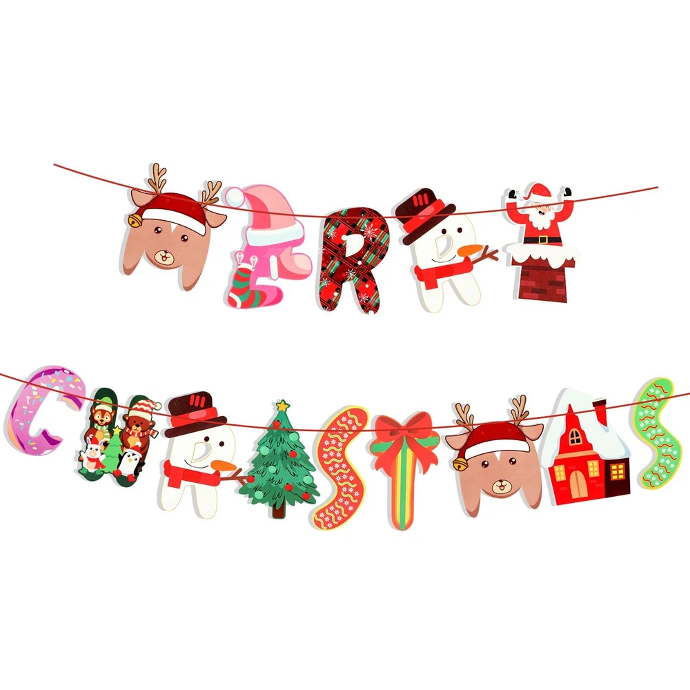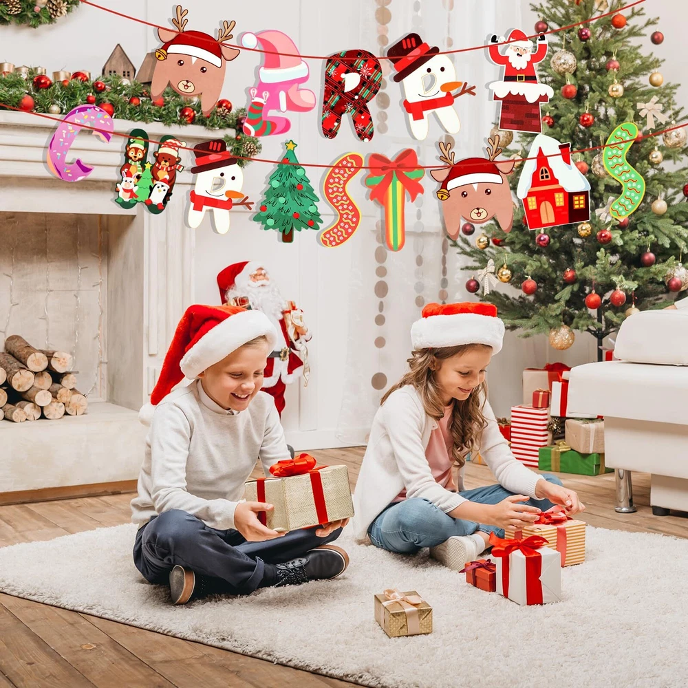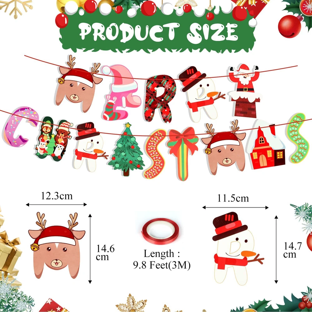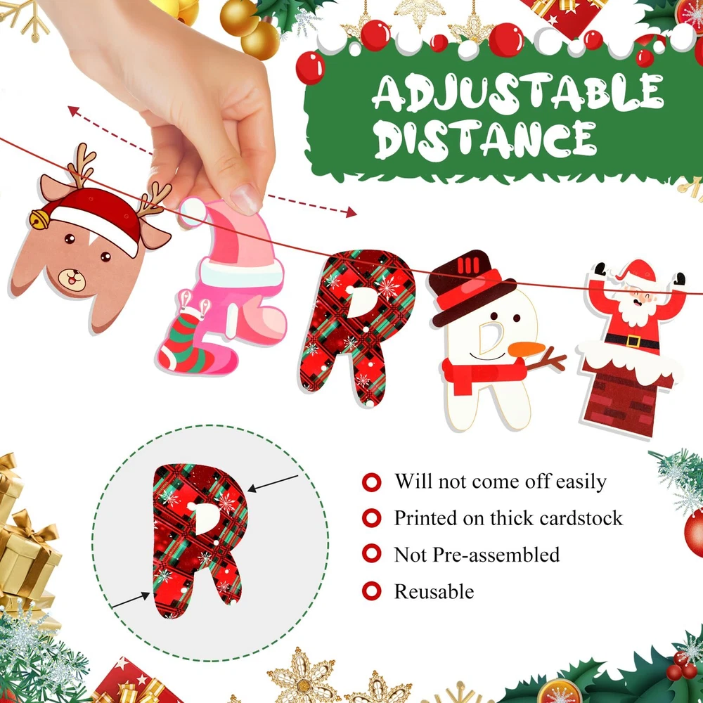 Christmas Banner Decorations Products Included : Merry Christmas Paper Banner(you need to connect it yourself) and a roll of red ribbon(9.8feet/3m). Exquisite Design and Cute Elements : The banner features classic Christmas elements such as snowmen, reindeer, Christmas tree, Santa Claus, scarves, etc., designed in the letter shape of Merry Christmas. These cute patterns paired with bright colors make the entire banner look both delicate and playful, making it perfect for decorating holiday parties. High Quality Materials : Using high-quality paper materials to ensure the durability and aesthetics of the banner. The banner colors are bright and long-lasting, not easy to fade or deform. At the same time, the lightweight material makes hanging more convenient and efficient. Whether using hooks, ropes, or tape, it can be easily fixed without causing damage to the wall. Wide Application : This banner is not only suitable for home decoration, such as living rooms, bedrooms, dining rooms, etc., but also adds a festive atmosphere to festivals; It is also particularly suitable as a decoration for Christmas parties, hanging on the party site or as a photo background, allowing guests to feel a strong festive atmosphere and leave beautiful memories. In addition, it is also suitable for outdoor decoration, such as gardens, terraces, etc., adding a beautiful scenery to festivals. Best Service : If you encounter any problems during the purchase or use process, please contact us and we will reply to you within 24 hours.