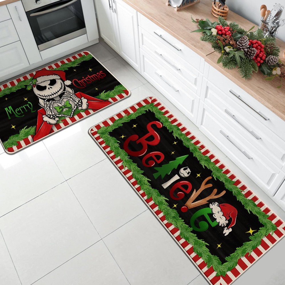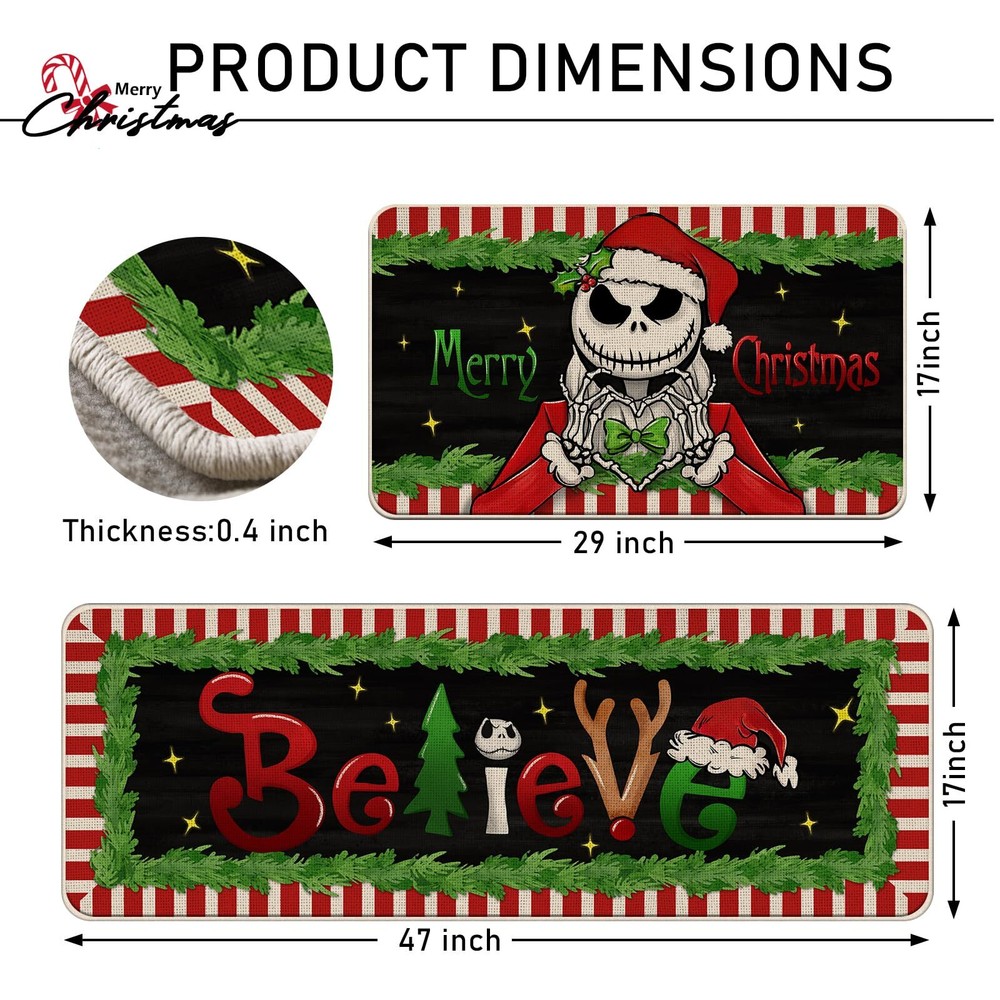 Merry Christmas Believe Kitchen Rugs Set of 2, Festive Jack Xmas Mats Decor for Holiday Style