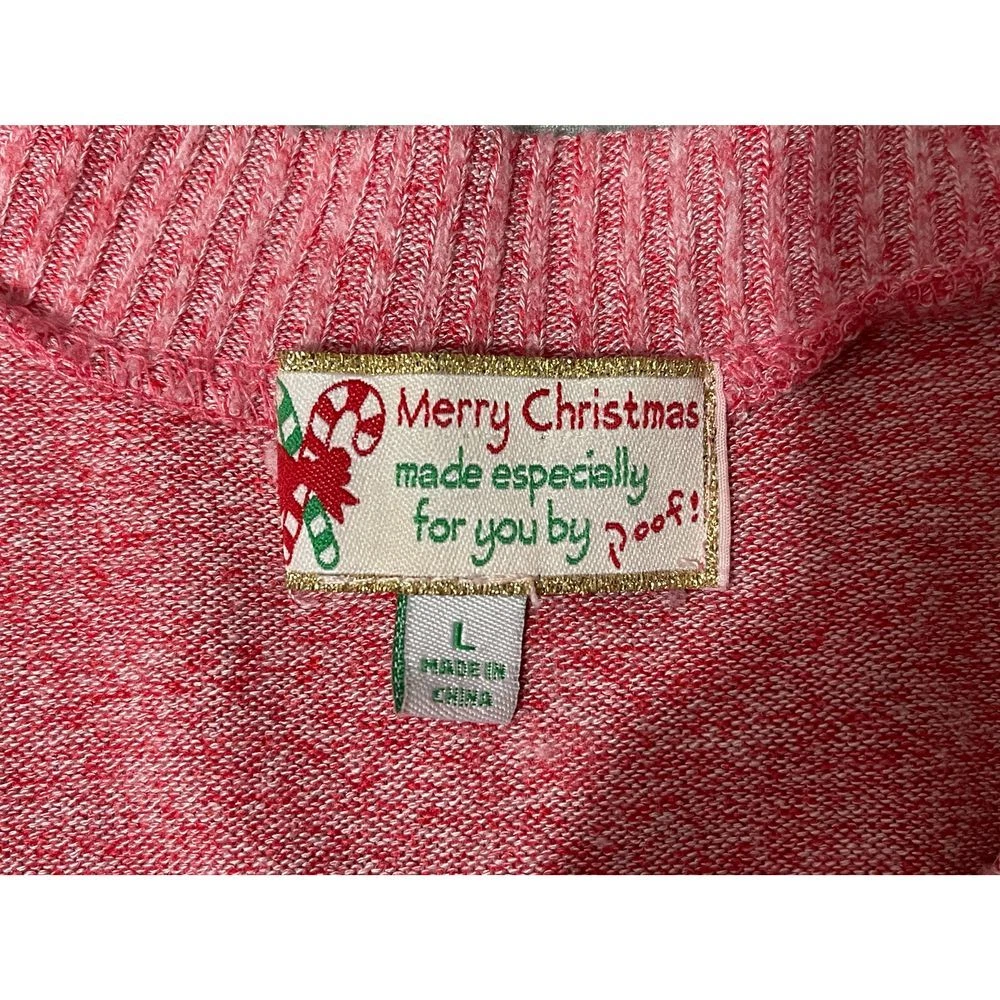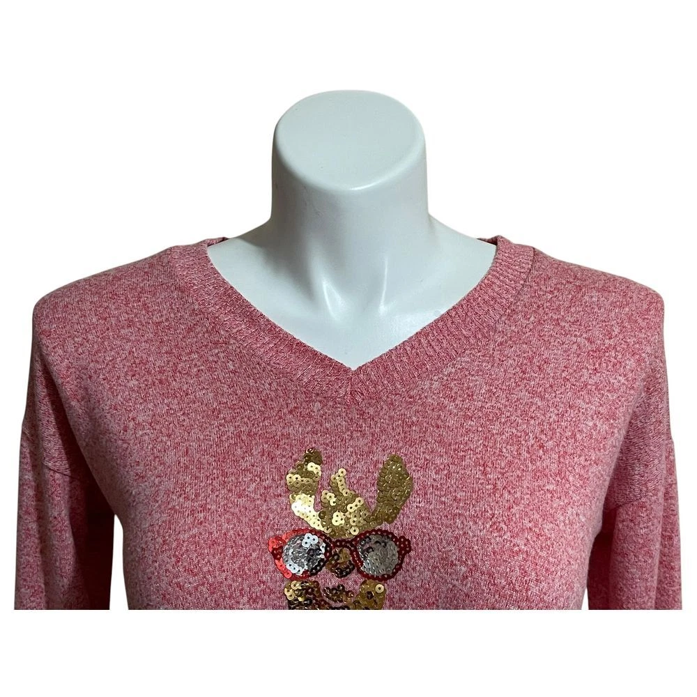 Make a festive statement with this playful pink sparkly sweater featuring a whimsical sequined Llama wearing sunglasses! The twisted front detail adds a modern, flattering touch. Perfect for holiday parties, casual Christmas gatherings, or adding some fun to your winter wardrobe. The soft knit material offers comfort while the sequin design brings the perfect amount of sparkle and cheer to any celebration. Style: Pullover Color: Pink Department: Women Type: Sweater Neckline: V-Neck Sleeve Length: Long Sleeve Pattern: Solid Features: Twisted Front, V-Neck, Sparkly Fabric, Holiday Design, Fitted Character: Llama Sleeve Type: Raglan Sleeve Fabric Type: Cotton/Rayon/Spandex Knit Accents: Sequins Condition: Good Preowned. A few sequins are missing. Please see all photos! Measurements approximate taken flat: Bust 17"/Waist 16.5"/Length 22" Keywords: christmas sweater, holiday pullover,reindeer, Llama, pink festive sweater, holiday party, winter fashion, novelty sweater, christmas outfit