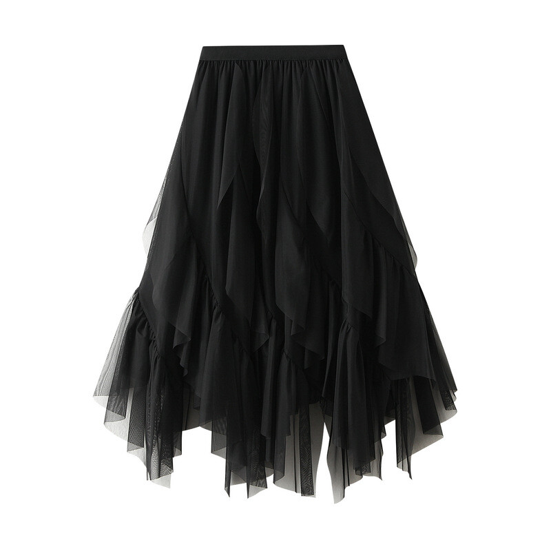 Ruffle Edge Mesh Skirt Women's Spring High Waist Mesh Skirt Half Skirt Color: Black Green Apricot Khaki Pink Size: equal size Waist 60-110CM, skirt length 84CM, skirt lining 53CM Material: Polyester Type: Skirt