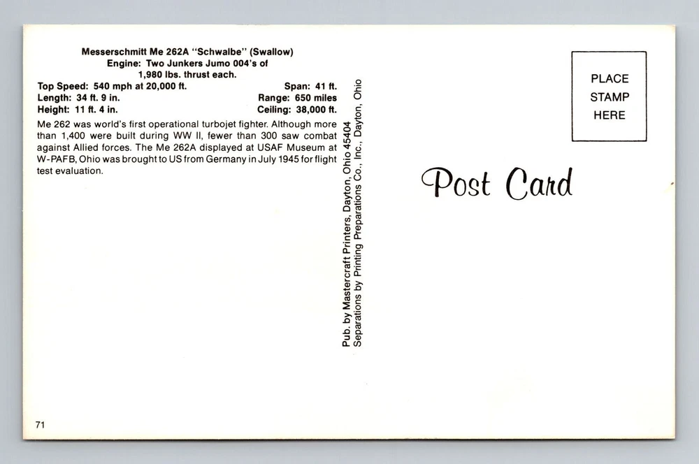Messerschmitt Me 262A "Schwalbe", Plane, Transportation Antique Vintage Postcard