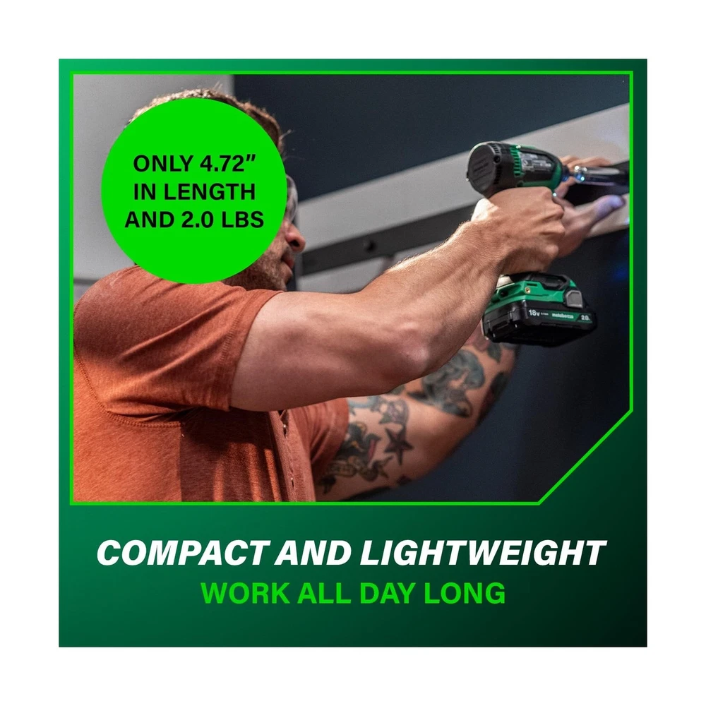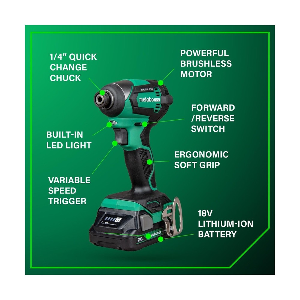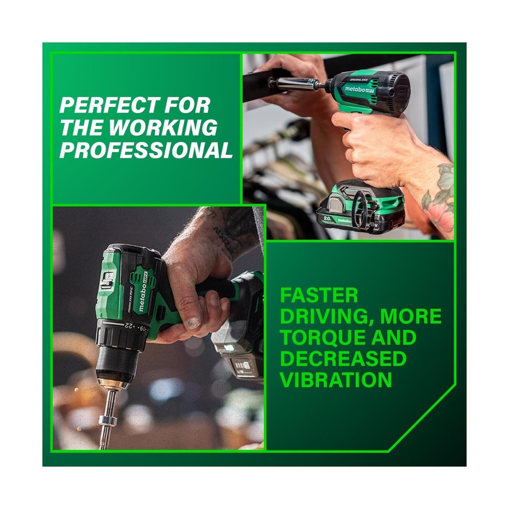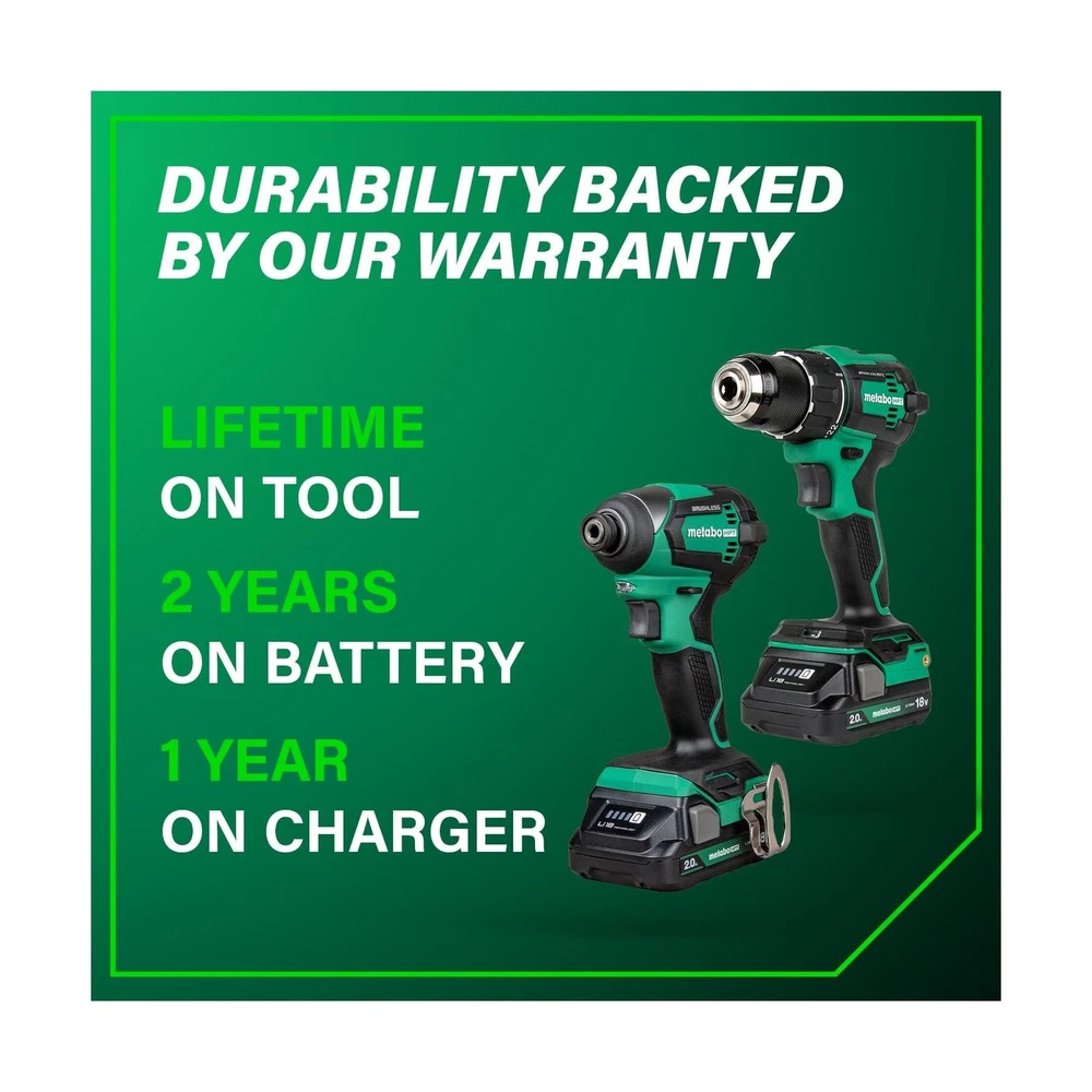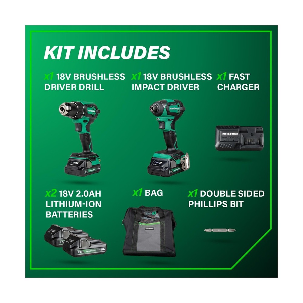 Metabo HPT 18V MultiVolt Cordless Brushless Driver Drill & Impact Driver Combo Kit, Power Tool Kit, 2 Lithium-Ion Metabo HPT Batteries and Charger, High Torque, Compact Lightweight Design, KC18DEXQB Description INTRODUCING THE METABO HPT 18V MULTIVOLT™ CORDLESS BRUSHLESS DRIVER DRILL & IMPACT DRIVER COMBO KITThe Metabo HPT 18V MultiVolt™ Cordless Brushless Driver Drill & Impact Driver Combo Kit is a must-have for contractors, homeowners, and DIY enthusiasts. This kit includes two high-performance power tools—the 18V Brushless Driver Drill and 18V Power Impact Driver—delivering up to 620 in-lbs and 1,549 in-lbs of turning torque respectively. This combo kit is backed by Metabo HPT's Lifetime Tool Body, 2-Year Battery, and 1-Year Charger Warranty.HIGH-PERFORMANCE TOOLS FOR VERSATILE APPLICATIONSThe Driver Drill and Impact Driver in this combo kit are powered by advanced Brushless Motor Technology, ensuring longer run time, increased power, and extended durability. Both tools feature LED lights to illuminate dark workspaces. The Driver Drill also features Reactive Force Control for added safety. Despite their power, both tools are lightweight and compact, making them easy to handle and ideal for tight spaces.COMPLETE COMBO KIT FOR EXTENDED RUN TIMEThis combo kit includes everything you need for extended operation: (1) 18V Brushless Driver Drill, (1) 18V Power Impact Driver, (2) 2.0Ah 18V Metabo HPT batteries with charge indicators, and (1) Quick charger. (1) 2 Phillips Bit, and (1) Carrying Bag. The batteries are compatible with 18V and 18V/36V MultiVolt tools, ensuring extended use across multiple tools.CHOOSE METABO HPT FOR PROFESSIONAL-GRADE RELIABILITYMetabo HPT power tools are engineered for durability, safety, and performance. With a legacy of quality craftsmanship, Metabo HPT tools are trusted by professionals and DIY enthusiasts alike. Discover our full range of innovative tools and accessories at the Metabo HPT store. Features: HIGH PERFORMANCE POWER TOOLS: This combo kit includes the 18V Brushless 1/2" Driver Drill (DS18DEX) and 18V Power Impact Driver (WH18DEX), delivering up to 620 in-lbs and 1,549 in-lbs of turning torque respectively. Ideal for contractors, homeowners, and DIY. BRUSHLESS MOTOR TECHNOLOGY: Ensures more run time, increased power, and extended durability. Each tool features a LED light to illuminate dark workspaces, and the Cordless 1/2" Driver Drill features Reactive Force Control (RFC) for added safety. LIGHTWEIGHT AND COMPACT: Both the 1/2" Driver Drill and Impact Driver tools are under 3 lbs (without battery) and compact (Driver Drill is 6.1" in length and Impact Driver is 4.72" in length), reducing user fatigue and allowing access to tight spaces. LONGER RUNTIME WITH METABO HPT BATTERY: The kit includes 2x 2.0Ah 18V Metabo battery with charge indicators for extended run time. The batteries are compatible with 18V and 18V/36V MultiVolt tools, doubling your runtime for up to 8.0Ah per charge. CHOOSE METABO HPT FOR QUALITY AND RELIABILITY: This Driver Drill & Impact Driver Combo Kit is backed by Metabo HPT's Lifetime Tool Body, 2-Year Battery, and 1-Year Charger Warranty. Get more durable power tools at the Metabo HPT store. Product Details: Brand: Metabo HPT Voltage: 18 Volts Battery Cell Composition: Lithium Ion Number of Batteries: 2 Lithium Ion batteries required. (included) Item Torque: 1549 Inch Pounds Amperage: 2 Amps Included Components: 18V Brushless Driver Drill (DS18DEX), Impact (WH18DEX), 2 Lithium-Ion Batteries with charge indicators, 1 Charger, Phillips bit, and Carrying bag Unit Count: 1.0 Count Power Source: Battery Powered UPC: 717709029262 Manufacturer: Koki Holdings America, Ltd Part Number: KC18DEXQBM Item Weight: 10.38 pounds Product Dimensions: 6.18 x 3.35 x 8.5 inches Item model number: KC18DEXQB Batteries: 2 Lithium Ion batteries required. (included) Style: KC18DEXQB Only Finish: Brushed Material: Blend Pattern: Solid Shape: Rectangular Item Package Quantity: 1 Batteries Included?: Yes Batteries Required?: Yes Warranty Description: 1 Year Charger, 2 Year Battery Date First Available: February 13, 2023 Delivery We Do Not Ship Outside of the Continental US. Return Policy All items qualify for returns within 30 days of receipt. Seller is responsible for return shipping on any item that is not damaged. Feedback We take our reputation seriously, we buy and sell online, so we understand the value of trust. If you are unsatisfied with your order, please contact us and we will work with you to resolve it to your satisfaction.