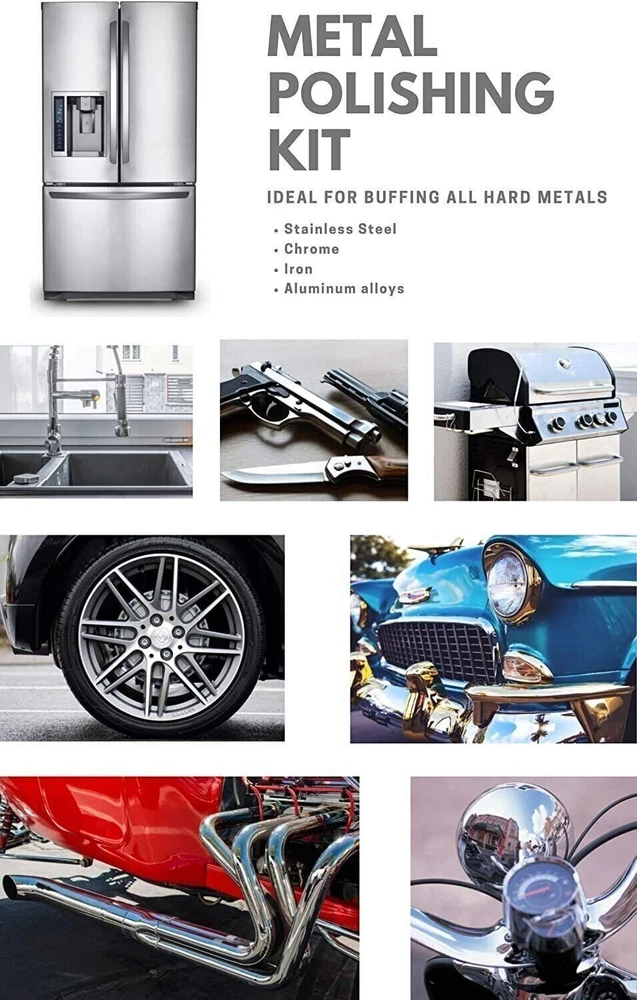 eBay Listing Template: LM-Raven LINE10 Tools Metal Buffing Kit for Drill 4 Inch Wheel for Polishing Hard Metals 7pc Product Features: Kit includes everything you need to transform your drill into a metal buffing and polishing machine Three easy steps for buffing and polishing hard metals such as Stainless Steel, Iron, and Aluminum Alloys Restore the shine back to your automotive trim, aluminum wheels, and stainless steel hardware, appliances, and parts Portable and convenient, this kit comes with a handy drill arbor adapter with a universal 1/4-inch round shank Compatible with all electric and cordless drills and drill-presses. Overview: #1 Buffing Compound With Yellow Wheel Apply the #3 compound onto the yellow wheel for heavy-duty cleaning and oxidation and tarnish removal, If needed. #2 Buffing Compound With Yellow Hard Wheel Apply the #3 compound onto the yellow hard wheel for medium buffing of metal. to remove scratches and blemishes, repeat until the color is clear and unified. #5 Buffing Compound With White Soft Wheel Apply the # 6 compound onto the white soft wheel, and repeat this step until you get the desired high gloss mirror-like finish. This Kit Includes: Drill Chuck Arbor Adapter Allows you to transform any drill into a buffing and polishing machine. Two 4" Hard Buffing Wheels Ideal for honing sharpened edges, removing scratches, and heavy-duty metal cleaning. 4" Soft Buffing Wheel Ideal for high gloss buffing and polishing metal surfaces to a mirror-like finish Three-Step Buffing Compounds Ideal for polishing hard metals, stainless steel, aluminum alloys, and iron. It is Super Easy and Can be Attached to Any Drill! Included arbor adapter will allow you to mount the buffing wheels on your drill. With a universal round 1/4-inch shank, you are able to transform your ordinary drill into a versatile, portable buffing machine. Amazing Results! Ideal for buffing and polishing hard metals such as stainless steel, iron, and aluminum alloys. Restore the shine back to your automotive trim, aluminum wheels, and stainless steel hardware, appliances, and parts. More than just an online store; we're here to inspire you to pick up your tools and start creating! Established in 2012, we bring you the versatile solutions you need to get your arts & crafts or home improvement projects off the blueprints and into reality.