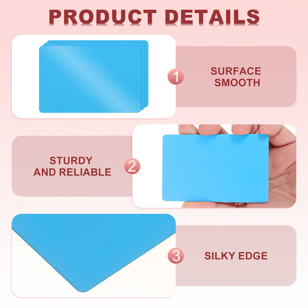 Document What is this?Elevate your networking game with our Good-Quality Blank Metal Business Cards. Crafted from sturdy stainless steel, these cards not only look impressive but also provide durability for everyday use.What will I get?Overall Size: 86 x 54 x 0.8mm / 3.39 x 2.13 x 0.03 inchSmall Cable Ties Size: 200 x 12mm / 7.87 x 0.47 inchLarge Cable Ties Size: 300 x 12mm / 11.81 x 0.47 inchColor: Sky BlueIn the package of: 100 Pcs Blank Metal Business Cards & 10 Pcs Small Cable Ties & 10 Pcs Large Cable TiesIs there any advantages of the product?Made from stainless steel, our blank metal business cards are designed to withstand wear and tear, ensuring a lasting impression. The modern, minimalist design offers a sophisticated look.How to use it?Suitable for engraving, stamping, or printing, our blank cards allow you to showcase your unique brand identity. Perfect for networking events, conferences, or as personal calling cards. Stand out from the crowd with an amazing card.What should I notice?Please check the size before you choose our product. Metal Business Card 3.39 x 2.13 Inch Blank Aluminum Sky Blue 100 Pcs What is this? Elevate your networking game with our Good-Quality Blank Metal Business Cards. Crafted from sturdy stainless steel, these cards not only look impressive but also provide durability for everyday use. What will I get? Overall Size: 86 x 54 x 0.8mm / 3.39 x 2.13 x 0.03 inch Small Cable Ties Size: 200 x 12mm / 7.87 x 0.47 inch Large Cable Ties Size: 300 x 12mm / 11.81 x 0.47 inch Color: Sky Blue In the package of: 100 Pcs Blank Metal Business Cards & 10 Pcs Small Cable Ties & 10 Pcs Large Cable Ties Is there any advantages of the product? Made from stainless steel, our blank metal business cards are designed to withstand wear and tear, ensuring a lasting impression. The modern, minimalist design offers a sophisticated look. How to use it? Suitable for engraving, stamping, or printing, our blank cards allow you to showcase your unique brand identity. Perfect for networking events, conferences, or as personal calling cards. Stand out from the crowd with an amazing card. What should I notice? Please check the size before you choose our product. Hot Item Payment 1.We accept eBay payment . 2.Payment must be received within 7 business days of auction closing. Shipping 1.We ship to your eBay or Paypal address. Please make sure your eBay and Paypal address is correct before you pay. 2.Items will be shipped within 1-3 business day when we received payment. 3.Delivery time depends on destination and other factors. Description Policy Metal Business Card 3.39 x 2.13 Inch Blank Aluminum Sky Blue 100 Pcs What is this? Elevate your networking game with our Good-Quality Blank Metal Business Cards. Crafted from sturdy stainless steel, these cards not only look impressive but also provide durability for everyday use. What will I get? Overall Size: 86 x 54 x 0.8mm / 3.39 x 2.13 x 0.03 inch Small Cable Ties Size: 200 x 12mm / 7.87 x 0.47 inch Large Cable Ties Size: 300 x 12mm / 11.81 x 0.47 inch Color: Sky Blue In the package of: 100 Pcs Blank Metal Business Cards & 10 Pcs Small Cable Ties & 10 Pcs Large Cable Ties Is there any advantages of the product? Made from stainless steel, our blank metal business cards are designed to withstand wear and tear, ensuring a lasting impression. The modern, minimalist design offers a sophisticated look. How to use it? Suitable for engraving, stamping, or printing, our blank cards allow you to showcase your unique brand identity. Perfect for networking events, conferences, or as personal calling cards. Stand out from the crowd with an amazing card. What should I notice? Please check the size before you choose our product. Hot Item Payment 1.We accept eBay payment . 2.Payment must be received within 7 business days of auction closing. Shipping 1.We ship to your eBay or Paypal address. Please make sure your eBay and Paypal address is correct before you pay. 2.Items will be shipped within 1-3 business day when we received payment. 3.Delivery time depends on destination and other factors.