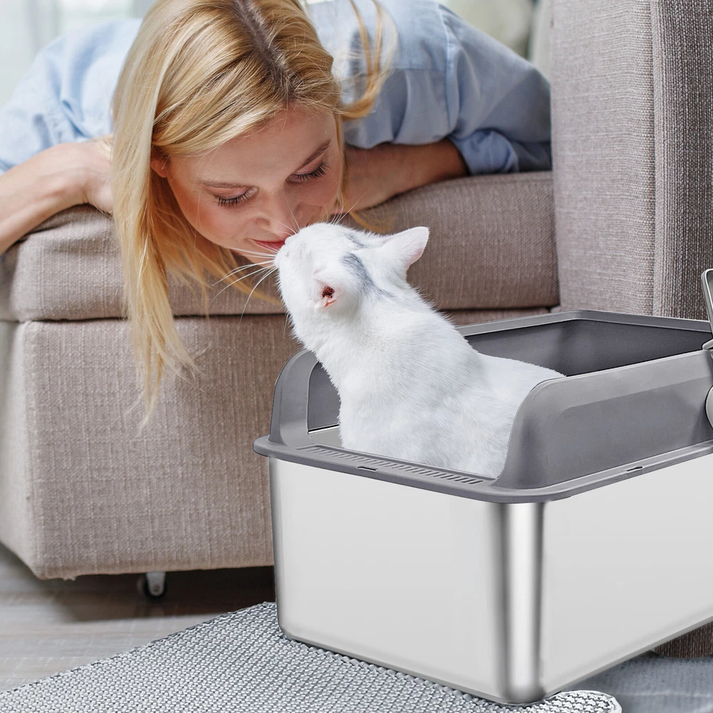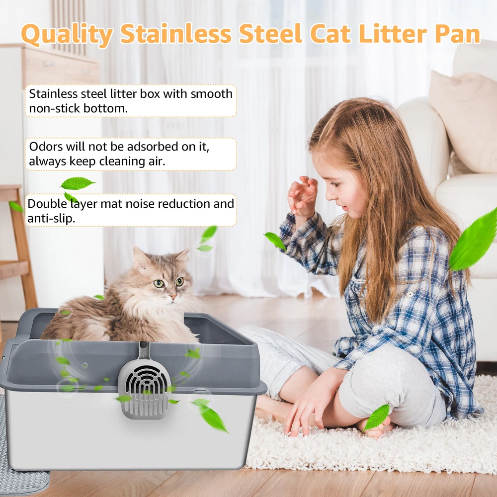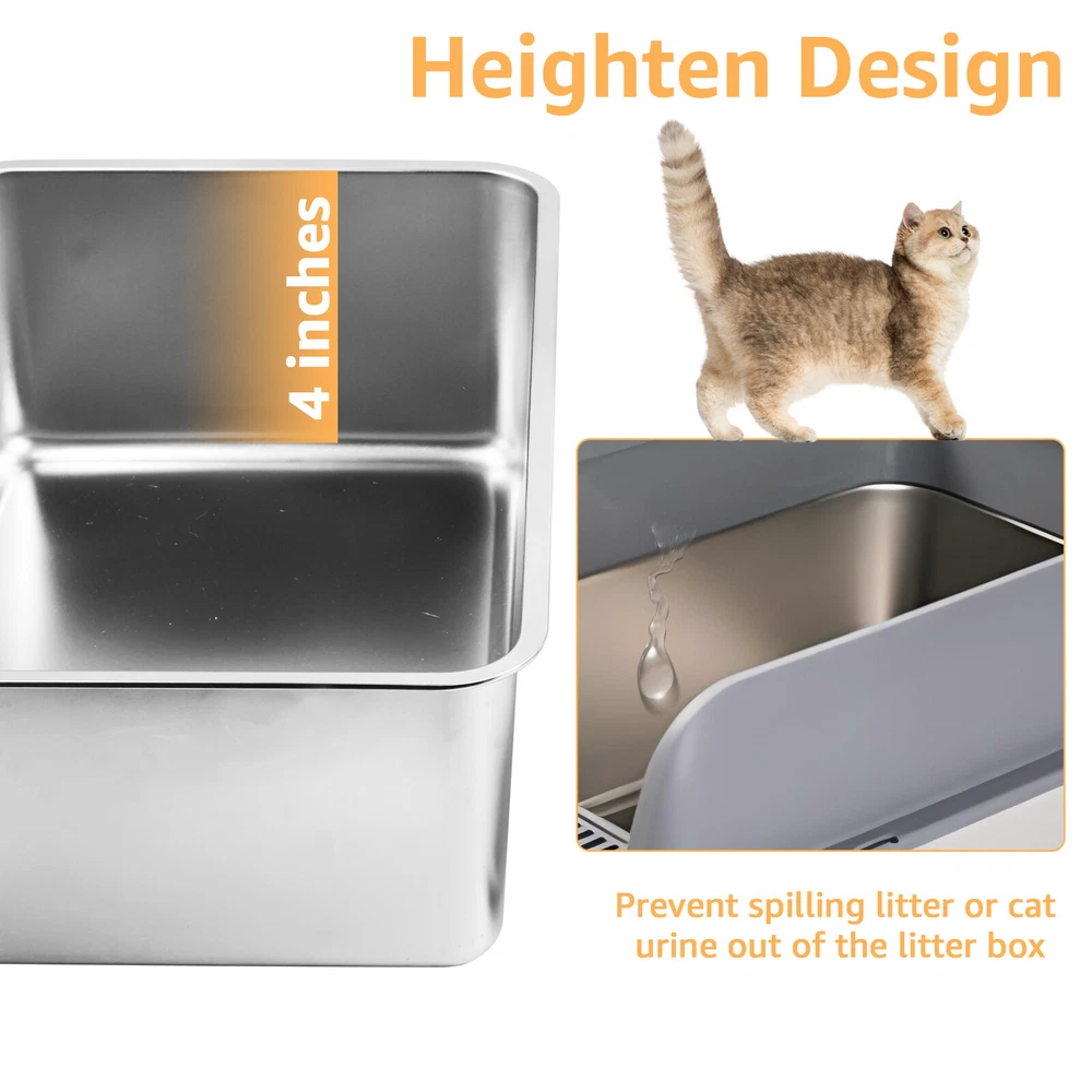 Metal Cat Litter Box Stainless Steel High Sided Open Top with Scoop, XL, Grey