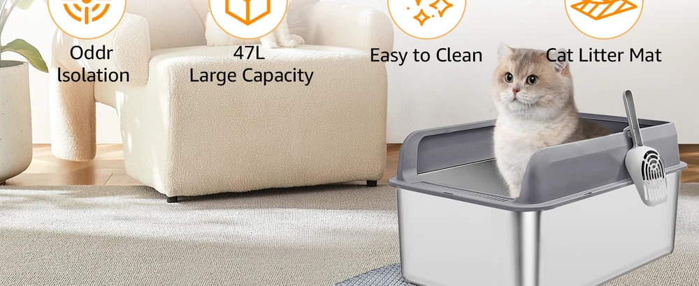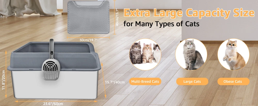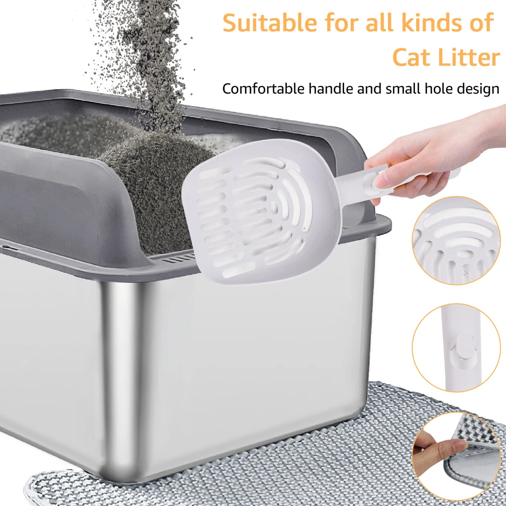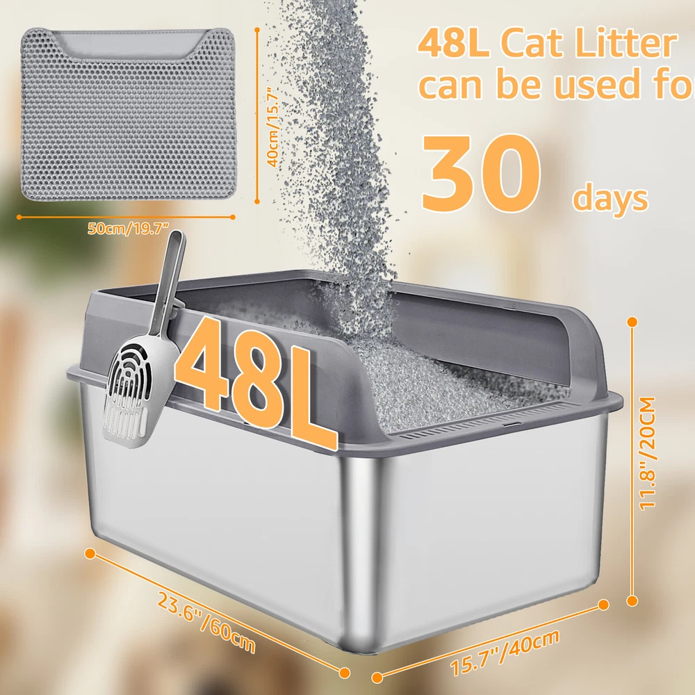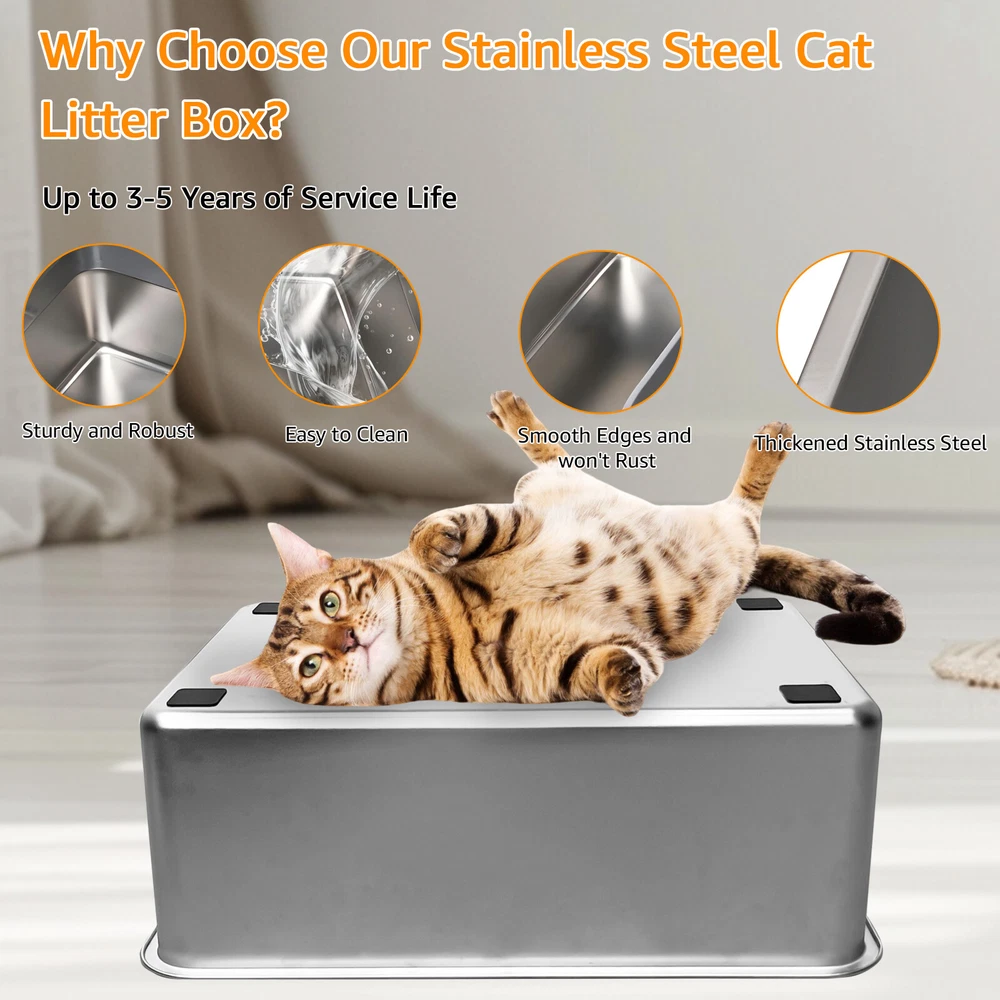 Metal Cat Litter Box Stainless Steel High Sided Open Top with Scoop, XL, Grey