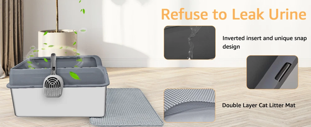 HomeMetal Cat Litter Box Stainless Steel High Sided Open Top with Scoop, XL, Grey