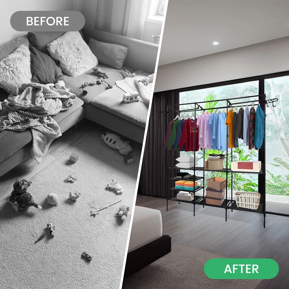 Metal Clothes Organizer Heavy Duty Garment Adjustable Rack Closet Storage Shelf Description: This practical and fashionable coat rack is a great multi purpose combination of coat hanger, storage rack and hanging rail, helping you well organize your clothes, shoes, umbrellas, hats and bags in your entryway, bedroom, office, etc.. 3 in 1, saving space. It is made of high-quality material, which is strong in bearing capacity, stable and durable. This item is also easy to use and simple to install, make your room tidy and organized. Specification: Type: Multifunctional Coat Rack Material: High-quality iron pipe, Non-woven Fabric Whole size: 160*36*170cm/63*14*67 inches Color: Black Shape: As Picture Shows Pattern: Solid Style: Modern Assembly Required: Yes Mounting Type: Free standing Room: Living Room/Bedroom/Bathroom Feature: [PORTABLE WARDROBE RACK] - This garment rack is great for creating storage space to organize your clothes and shoes in your laundry room and bedroom. Simple and chic design adds instant storage to your room. This portable coat rack is made of highly-quality iron pipe, which is strong in bearing capacity, stable and durable. It can be easily located anywhere in your house. [STURDINESS & DURABILITY] - The thickened round tube is firm and wear-resistant, and has large load capacity. Even if you have more clothes, it can bear it. [PLENTY STORAGE SPACE] - Extra large clothes closet rack with 2 clothes rails, it can hang coats, long dresses, jackets, and other heavy clothes. The underlying is equipped with multilayer shelving to add extra space to store bedding, shoes, and boxes. [WONDERFUL DETAILING] - The design with 360° rotatable hooks on both sides is more flexible and practical, it enables you to adjust the angle freely, according to room space and item size, effectively increase horizontal space utilization to fit tight space, adding more space for hanging bags, scarves or other items. [MULTIPLE USES] - Its compact design makes it ideal for any place of your home without taking too much space but with lot of storage space, such as laundry room, bedroom, walk-in closet ,kitchen, attic etc. [EASY TO ASSEMBLE] - -Easy to Assemble and Clean: The coat rack can be quickly assembled according to the instruction and the parts provided. Simply wipe with a cloth to clean the surface of the rack. Package Contents: 1*Garment Rack 1*Instruction Note: 1. Please read the instruction carefully before assembling. If you have any questions about the product, please contact us. 2. The picture may be a little different from that of real item due to the different display and different light. 3. Due to different producing batches, product details might be a little different. If you mind the difference, please buy with caution. Thank you for your understanding. 4. Please allow minor differs due to manual measurement. We can only accept Paypal payment only. You can send payment to our paypal account by many payment methods(Credit or debit card through PayPal). 1. Items are US stock. 2. Item will be shipped out within 1- 2 Working days upon your payment completed. 3.Please do not hesitate to contact us if you have any questions about our products. We will be responsible for any damages or losses incurred in the shipping process. 1.If there are any problems with our products,Please feel free to contact us.We will always here to solve them for you.You don't need to contact ebay or paypal.And please DO NOT leave us Neutral/Negative feedback,It won't help the problem to be solved.And it is the worst hurst to a seller.We should try our best to make a happy easy transaction. 2.If you are satisfied with our products and our service,please tell your friend and leave us positive feedback;if you are not satisfied with our products or service,please DO tell us. 3.After receiving the item,you could contact us within 30 days.Refund will be given as money back or item exchange 1. Usually, we reply for the messages within 24 hours, if you do not get response within 1-2 Working days , please check your Messages box one more time or Please email us AGAIN. 2. Email is the priority of our customer service, if you can't get us, please choose live response. 3. Positive feedback is automatically done once the payment is cleared. We appreciate your feedback. 4. The star-scores are very important to us. If anything about your transaction did not meet your expectations. Please let us know and give us the opportunity to work out for you before you leave feedback. Working Day: Monday to Friday Working Time: 9:00 am to 18:00 pm On Nov 19, 2023 at 17:47:17 PST, seller added the following information: