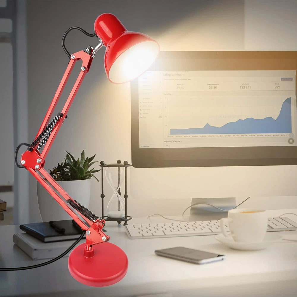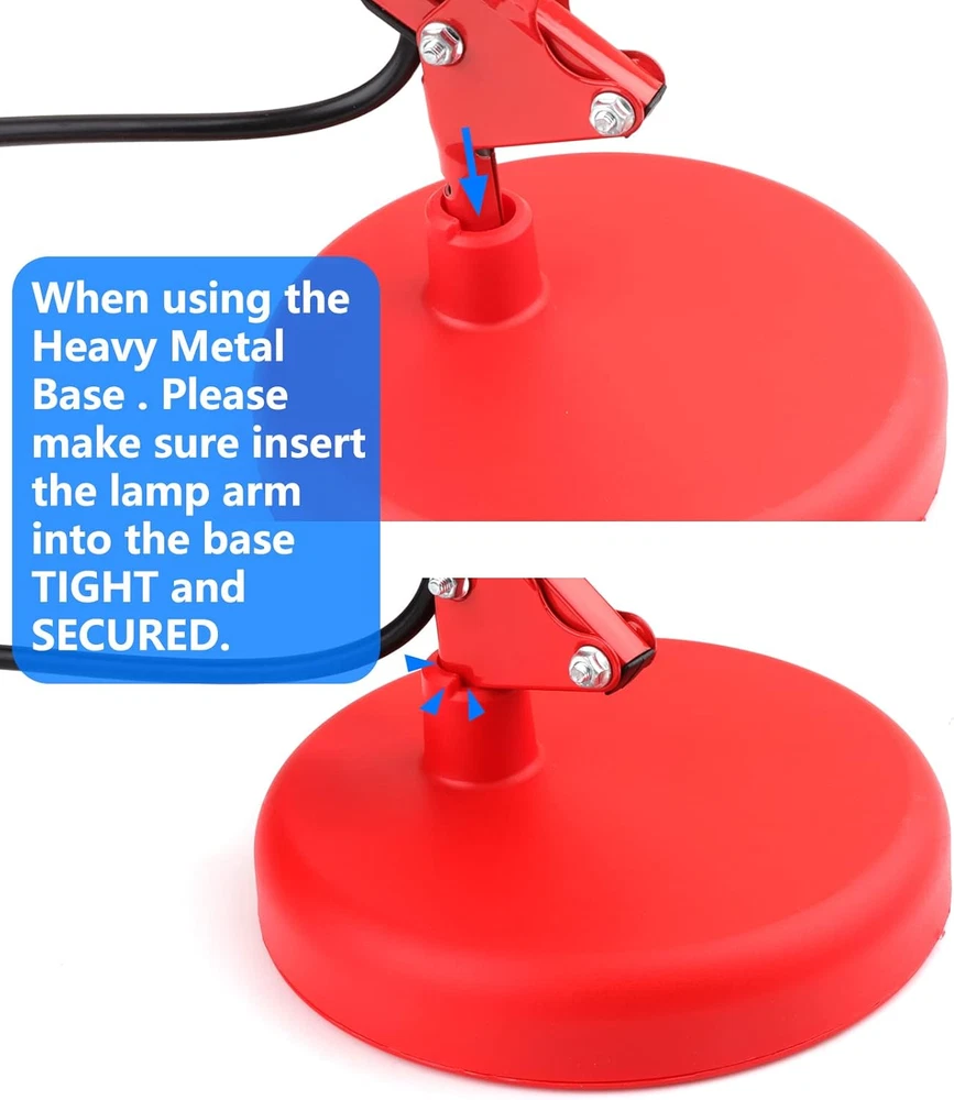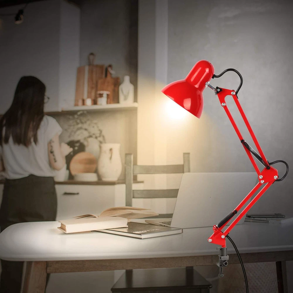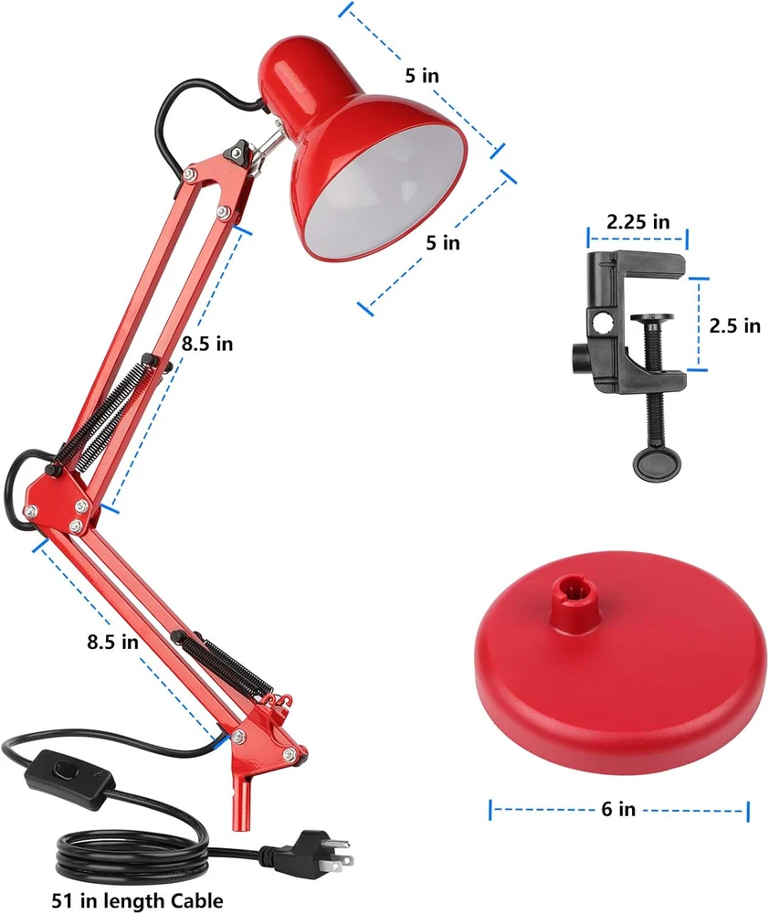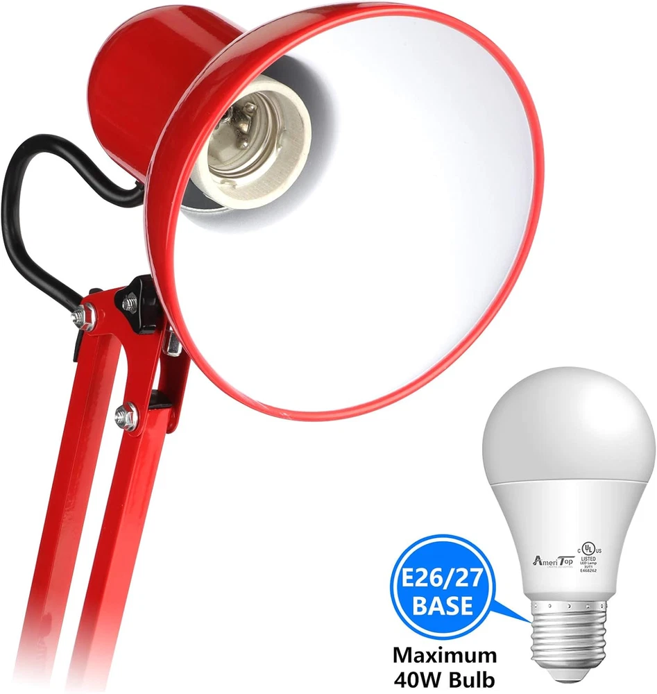 Store New Arrivals Add to Favorite View Feedback Contact Metal Desk Lamp, Adjustable Goose Neck Swing Arm Table Lamp with Interchangeable Base or Clamp; Eye-Caring Study Desk Lamps for Bedroom, Study, Office, Table (Red) Description Light Source Type Incandescent, CFL Style Metal Arm-Black Number of Items 1 Power Source Corded Electric Control Method Touch Batteries Included? No Lighting Method Adjustable Maximum Compatible Wattage 40 Watts Number of Pieces 1 Room Type Office Lamp Type Desk Lamp Product Dimensions 10.4"D x 7.1"W x 7.1"H Material Metal Installation Type Tabletop Finish Type Painted Specific Uses For Product Indoor use only Color Rendering Index (CRI) 81.00 Indoor/Outdoor Usage Indoor Recommended Uses For Product Indoor Water Resistance Level Not Water Resistant Connectivity Protocol Homeplug Item Weight 0.11 Ounces Connectivity Technology USB Special Features Swing arm, Bulb changeable, Instant On, Two Usages, Saving place, Adjustable Special Feature Swing arm, Bulb changeable, Instant On, Two Usages, Saving place, Adjustable Bulb Base E26 Shade Color Black,White,Red Mounting Type Tabletop Color Red Wattage 6 watts Base Material Metal Is Waterproof False Shape Desk Lamp Voltage 120 Volts Batteries Required? No Shade Material Metal Finish types Painted Switch Type Rocker Two Usages - With high-quality metal lampshade and base, enduring, durable and aesthetic, it can stand on the desk steady; Or with the adjustable c-clamp, you can clamp it onto any surface either vertical or horizontal up to 2” wide. For places like the school, dorm room, office, bedroom. Adjustable Lamp Arm - The desk lamp is flexible and lamp head is adjustable. It can be focused on any area you want to. Light up a large area and move its position with the flexible spring-balanced adjusted arm that can extend up to 18" and the rotatable base and shade. Premium Metal Desk Lamp - The lamp stands firmly thanks to the weighted base and the swing arm and lamp shade are made from solid metal with a black finish, making them durable and exquisite to look at. With exposed structural and mechanical elements, this lamp is a modern version of a true classic design and will complement the chicest décor. Easy to Use - The flexible swing arm which makes it easy to find the perfect lighting angle. Simple and lightweight. Its slim shape and 51” power cable means you can place it anywhere without taking up too much space and the easy to use on/off rocker switch ensures day-to-day use. Perfect for office, school, living room, bedroom, study room. Bulb Requirement - Bulb is not included in the package. With an E26 sized screw base, the bulb can be installed as desired(40W MAX). To give your lamp a beautiful soft white glow please search B085WB4Q3G and B085WBG126 for the best matches. Product Description PREMIUM QUALITY METAL SWING ARM DESK LAMP The lamp stands firmly thanks to the weighted base and the swing arm and lamp shade are made from solid metal with a black finish, making them durable and exquisite to look at. The power plug is UL-listed, making it safe to use. Its slim shape and 51” power cable means you can place it anywhere without taking up too much space and the easy to use on/off rocker switch ensures day-to-day use. Study This metal swing arm desk lamp gives out more concentrated and eye-caring glow, making it an optimum lighting choice for work and study. Bedroom This metal swing arm desk lamp is compact and has a strong retro style, letting it can match any interior decoration style. Office This metal swing arm desk lamp features flexible adjustment. The base, the middle swing arm and the lamp head all can be freely adjusted in accordance with actual needs. Flexibility Light up a large area and move its position with the flexible spring-balanced adjusted arm that can extend up to 18" and the rotatable base and shade. 2-IN-1 You can either stand this lamp up on its own or with the adjustable c-clamp, you can clamp it onto any surface either vertical or horizontal up to 2” wide. ON/OFF Switch This desk lamp is very easy to control only by flipping the on/off switch on the power cord. E26/27 Base This desk lamp is compatible with E26 base bulbs. It is very convenient to replace the bulb Warm Tips: 1. Fit for a bulb that is 40W max and both E26 and E27 bases can be used. 2. Please kindly check if the parts, components and accessories in the package is loose before assembly. 3. If you use halogen bulb or energy-saving bulb, these bulb will cause heat and the lamp shade will be affected to be heated as well (as lamp shade is made of metal). Do not touch the lamp shade if you halogen bulb or energy-saving bulb. ) Package Including: - 1 x Metal Desk Lamp (bulb not included) - 1 x 51 inches AC Cable - 1 x Clamp ABOUT US We offer the best prices around on high quality products. Our E-store includes media such as books, movies, music and games while offering electronics, toys, sporting apparel, clothing, tools, general home, garden items and more. SHIPPING We are always working hard to ensure your package arrives as soon as possible. Please understand that some factors like weather, high postal traffic, and the performance of shipping companies are outside of our control. We offer free shipping to the lower 48 states and ship within 2 business days of payment, usually sooner. We do not accept P.O. Boxes. Please provide a physical address. For shipping outside of the continental USA, we only use eBay's Global Shipping Program.The item is shipped to KY and then sent to the rest of the world. International customers are responsible for all duties and taxes. Continue to check out in order to calculate costs for shipping the item to your country. Messages regarding eBay's Global Shipping Program MUST be directed at eBay EXCLUSIVELY. RETURNS We offer a 30-Day Return Policy on items which you are not completely satisfied with. You have the option for a full-refund or an exchange of the item. No returns are availabl