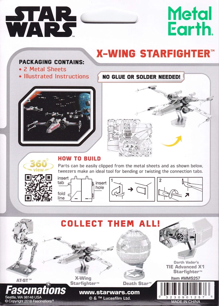Metal Earth Star Wars X-Wing Fighter 3D Metal Model Kit Fascinations HOBBY MODEL KIT – Unassembled model packed in an envelope with easy to follow instructions. Ideal for ages 14 and up. NO GLUE OR SOLDER NEEDED – Parts can be easily clipped from the metal sheets. Tweezers are the recommended tool for bending and twisting the connection tabs. X-WING STAR FIGHTER – 2 Sheets Model with an advanced difficulty level. Assembled Size: 4.02"L x 3.39"W x 2.05"H (10.2 x 8.6 x 5.2 cm) FROM STEEL SHEETS TO 3D – Pop out the pieces and connect using tabs and holes. Includes illustrated instructions. HIGHLY DETAILED ETCHED MODEL – Display your 3D model once completed - collect and build them all. Shipping We offer FREE shipping on all orders! We ship within Three business days of payment, usually sooner. We use a selection of shipping services such as UPS, FedEx, USPS etc. We only ship to the lower 48 states, no APO/FPO addresses or PO Boxes allowed. Local pickups and combined shipping options are not provided at this time. Return You can return a product for up to 30 days from the date you purchased it. Any product you return must be in the same condition you received it and in the original packaging. Please keep the receipt. Payment We accept payment by any of the following methods: PayPal Please pay as soon as possible after winning an auction, as that will allow us to post your item to you sooner! Feedback Customer satisfaction is very important to us. If you have any problem with your order, please contact us and we will do our best to make you satisfied. Contact Us If you have any queries, please contact us via ebay. We usually respond within 24 hours on weekdays. Please visit our eBay store to check out other items for sale! Thank you for shopping at our store.