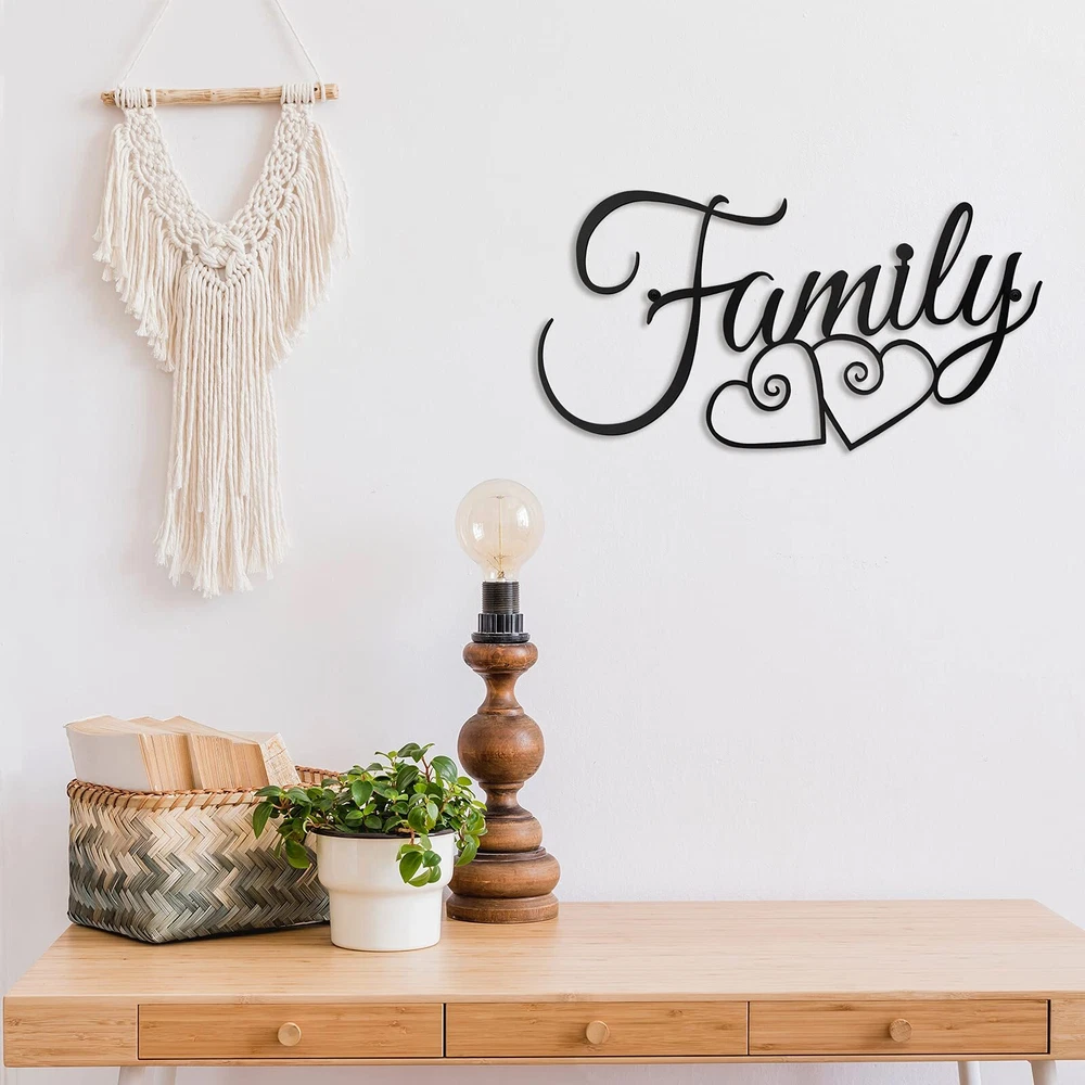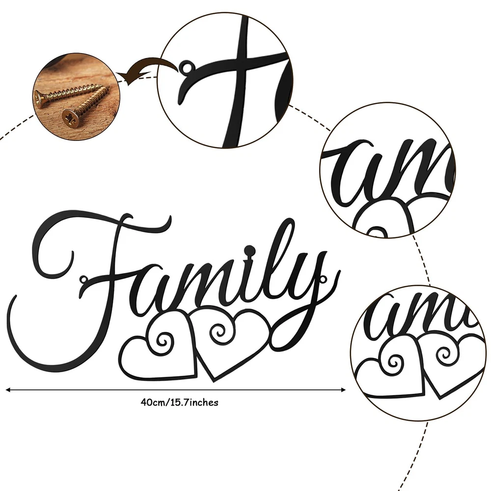 Features: Create warm atmosphere: The wall hanging sign can be applied as a wall, door, window and cabinet decoration, which can create the feeling of family, make your guests feel warm and at home. Sweet gift: You can give the black words wall decor to your friends, family members and colleagues as a housewarming gift, they will feel happy and sweet for receiving this thoughtful gift. Specifications: Material: metal Color: black Size: approx. 40 x 25 cm/ 15.7 x 9.8 inch Package includes: 1 x Family wall art decor Note: Manual measurement, please allow slight errors on size. The color may exist slight difference due to different screen display. Package contents: you will receive 1 piece of family wall sign in black color, you can use the wall sign to decorate your house, room and office, you can also share the decorations to your family members or friends Sturdy material: the metal family wall decor is made of metal, which is sturdy and serviceable, not easy to bend or rust, you can keep the decor for a long period of time, and the decor is smooth on the surface, you don't have to worry it will scratch the wall Easy to hang: the black word sign has a hole on each side, which is easy for you to hang it on the wall use the screws, and you can also choose from double-sided tape, magnetic suction and other tools that do not break the wall of your house Appropriate size: the wall hanging decoration measures approx. 40 x 25 cm/ 15.7 x 9.8 inches, which is suitable to use as the wall decorations, and the proper size makes the decor light in weight, it is not easy to fall down when hanging on the wall Widely applicable: the family word wall art is a nice decoration for your house, you can hang it on the bedroom, dining room, kitchen, corridor, or office, school and shopping stores, which can add some warm styles for the situations around you