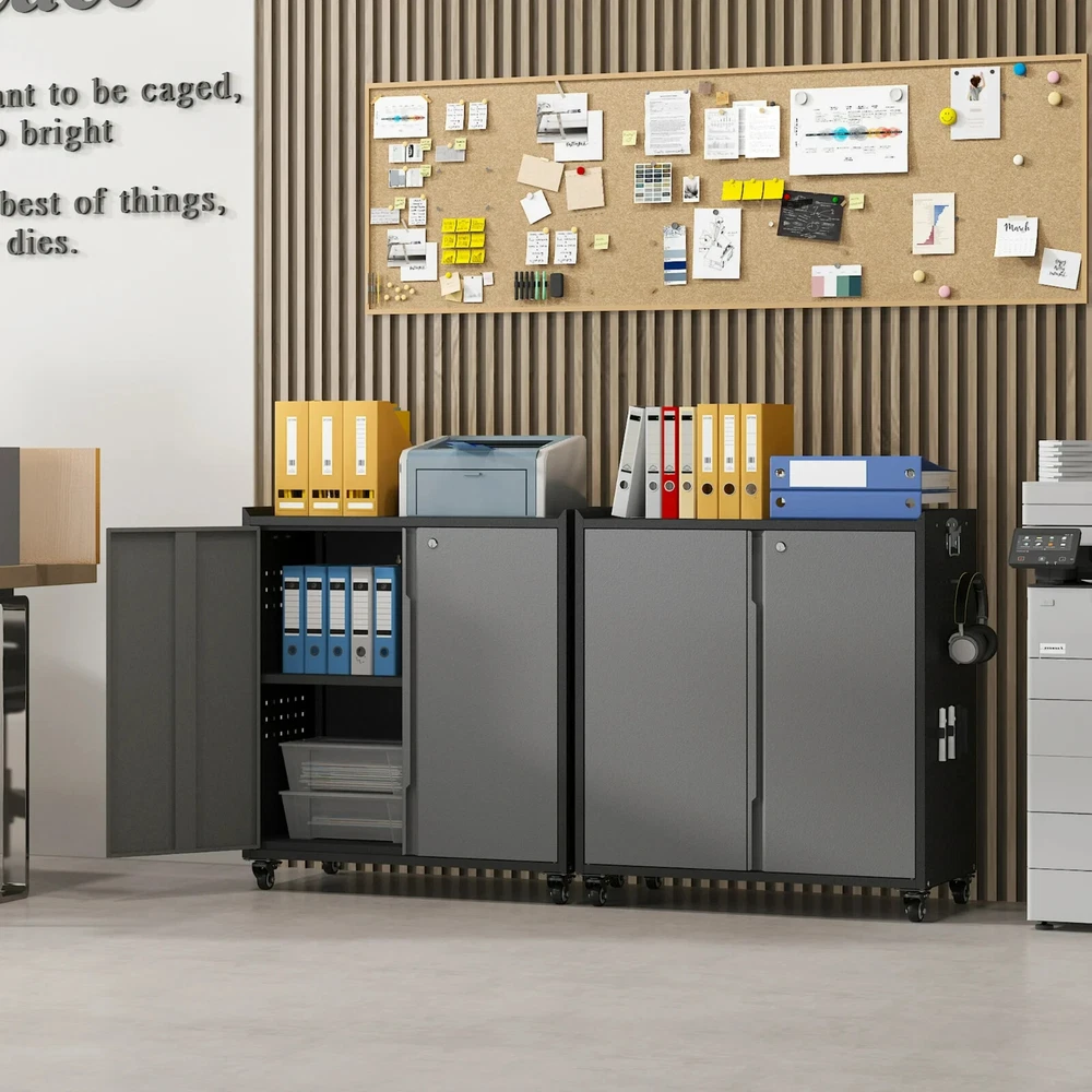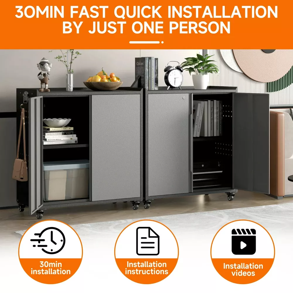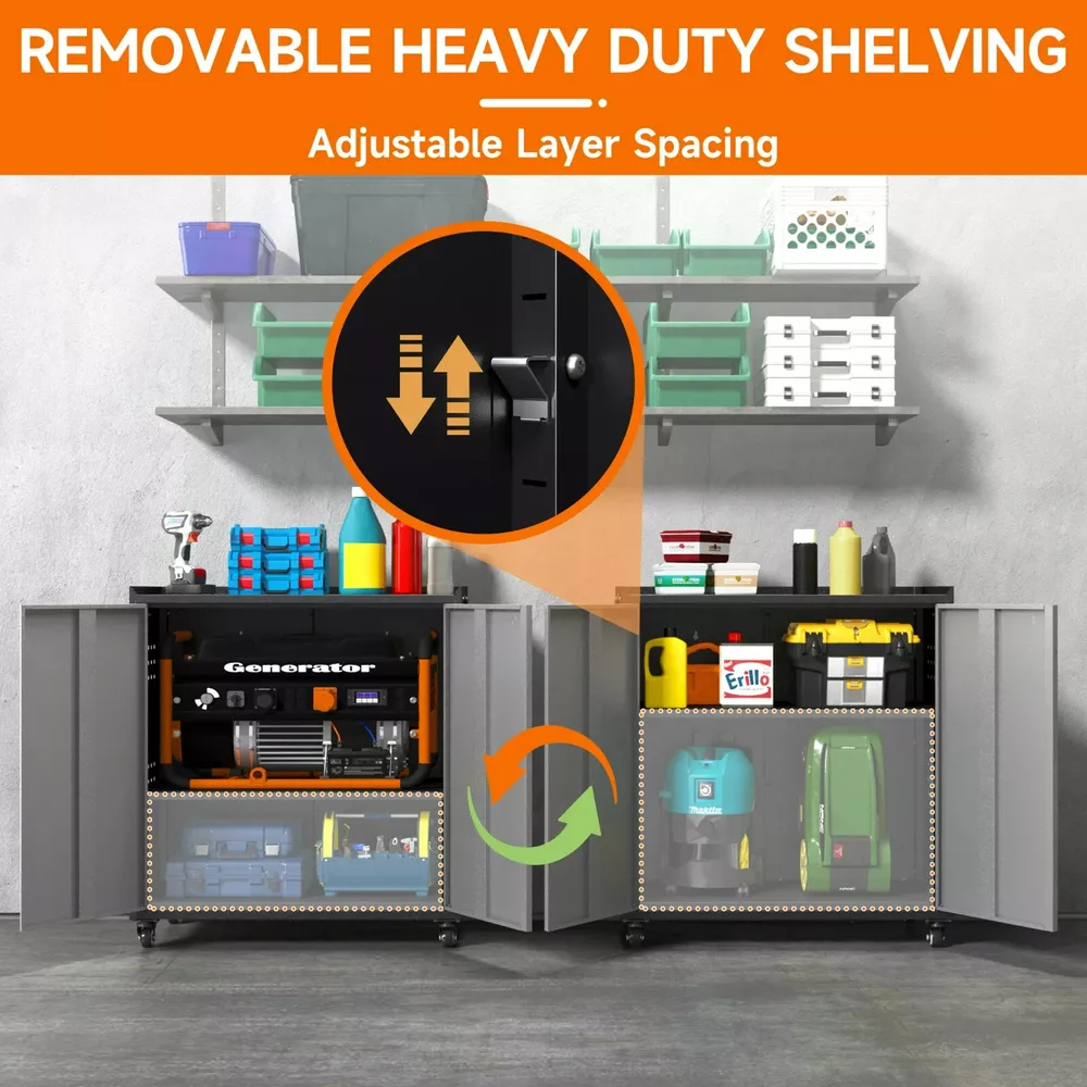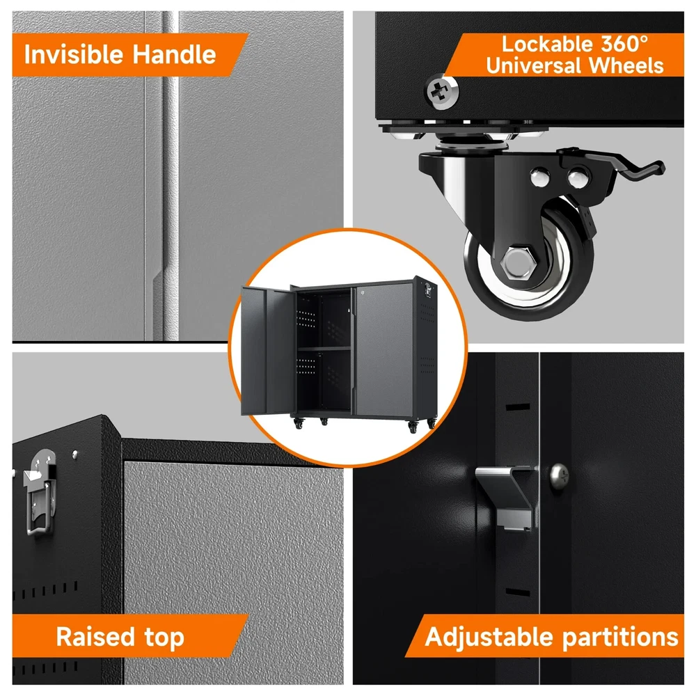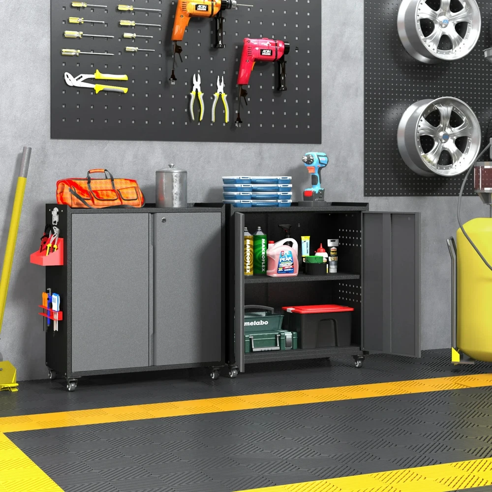 Metal Garage Storage Cabinet with Locking Doors and Adjustable Shelves,34.3" H Small Rolling Tool Storage Cabinet,Lockable Metal Tool Cabinet on Wheels for Garage, Warehouse, Barbershop-Black Gray About this item 🌟【STURDY & ENDURING】Crafted from sturdy cold-rolled steel, this sliding garage cabinets and storage system balances load-bearing strength with lasting endurance. There are 1 adjustable shelve and 2 tier storage space meet your needs to store different size items, each shelf of garage storage cabinets can load 120lbs. 🌟【MULTI-FUNCTIONAL SIDE HOLE DESIGN】In addition to being perfect for storing large quantities of items, the metal storage cabinets outside hanging hole design adds extra space to any room. An extra side rack can hold over drill bits in different sizes and styles and be a clean space for every handy stick-shaped tool like screwdrivers, pry bars, glue applicators, Etc. 🌟【360° SWIVEL SILENT CASTERS】Rolling tool cabinet was designed with 4 detachable and lockable 360° rotating casters, The tool cabinet with wheels can be easily moved to the desired location without lifting or carrying, thus providing convenient mobility and flexibility, making it a very practical storage and work tool. 🌟【SECURE STORAGE】Tool cabinet with doors adopts an upgraded version of the three-point lock system, and the steel rods are thickened to provide higher security for your valuables and important items. 2 keys included, which can be used by co-owners or as a backup in case of loss. 🌟【INSTALL AND SERVICE】Detailed parts labels and illustrated instructions are included in the package, you can also refer to the installation video to assemble and disassemble the practical metal garage cabinet easily. If you have any questions, please feel free to contact us, The 24-hour professional customer service team can help you in time. At a glance Brand Kooyon Material Metal Assembled product dimensions (l x w x h) 15.70 x 31.50 x 34.30 Inches Pieces 1 Finish Matte Number of shelves 1