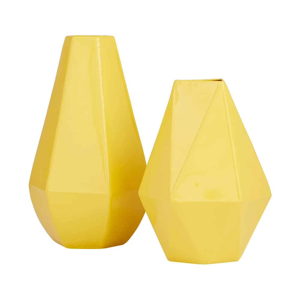 This subtle pair of accent vases perfectly compliment another as they are placed on top of pastel themed tables and furniture. Designed with felt or rubber stoppers at the base that prevent scratching furniture and table tops, as well as sliding around. This item ships in 1 carton. Suitable for indoor use only. This item ships fully assembled in piece. This yellow colored iron vase comes as a set of 2. Contemporary style. Vases have 2.50 in, and 2 in mouth openings. CONTEMPORARY HOME DÉCOR VASES: Embrace artistic expression with a style that highlights bold designs with sleek lines, neutral elements, and a minimalist aesthetic METAL VASES FOR CENTERPIECE: These geometric flower vases are crafted from pure and sturdy iron material YELLOW AND ORANGE VASES FOR FLOWERS: These vibrant metal bud vases feature a sunshine yellow iron finish GEOMETRIC ROUND VASES FOR HOME DÉCOR: This endearing set of iron bud vases showcase a solid color display with a short geometric bud shape and a tall pear shape vase design 2 SMALL SIZE FLOWER VASES CENTERPIECE: Each yellow metal vase measures 6.55L x 7.05W x 12H , 7.15L x 6.55W x 9.75H inches, and collectively weighs 3.3 lbs