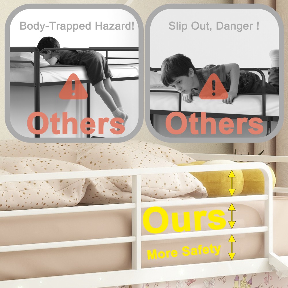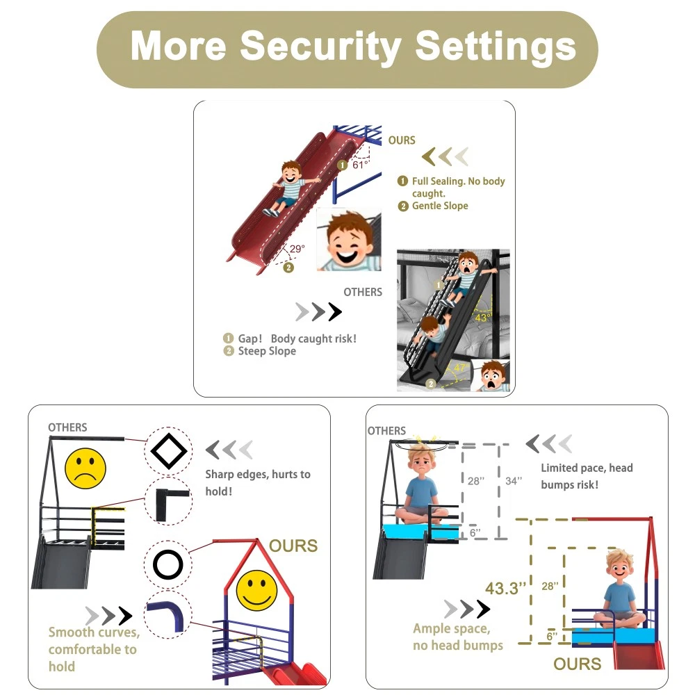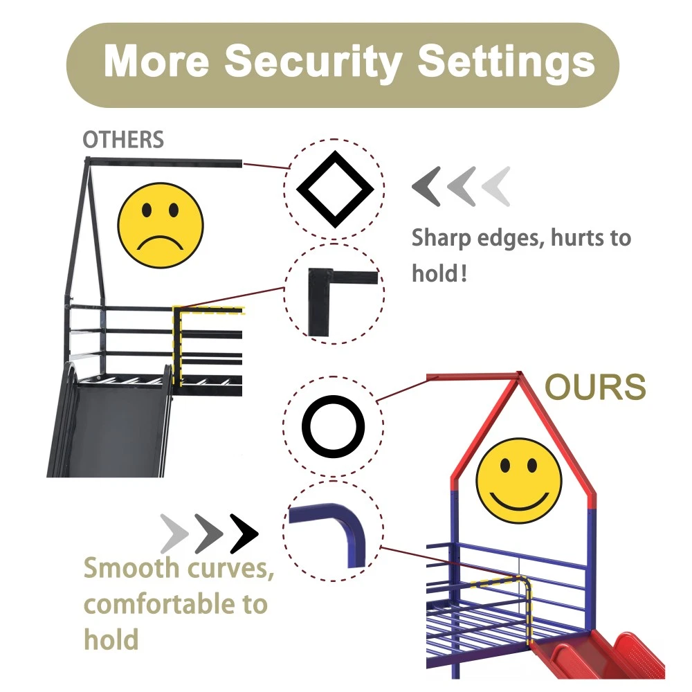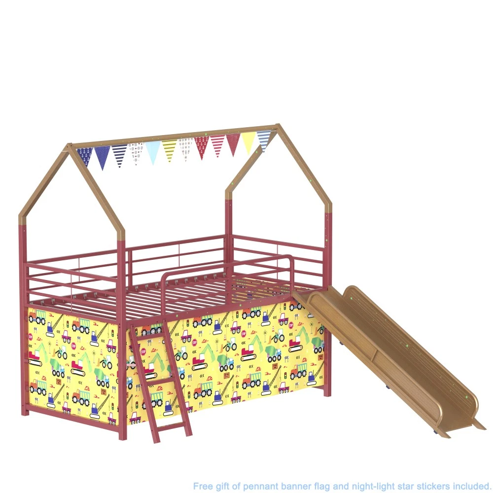 Origin: Malaysia | Color: Gold | Material: Metal | Style: Contemporary | Application: Bedroom Bed Specification: Twin Size | Bunk Type | Box Spring Not Required | Metal Frame 📏 Product & Package Dimensions Type Length (Inch) Width (Inch) Height (Inch) Weight (Lbs) Assembled Product 76.69 97.83 74.65 82.50 Package 79.13 15.94 7.28 92.80 ✨ Key Features Playful Haven for Imaginative Play: Turn your kid's bedroom into a fun sanctuary with this house-shaped bunk bed equipped with a smooth slide! Comes with a pennant banner flag and luminous star stickers for DIY decoration—let your child unleash creativity. The lower bed's curtain creates a cozy private nook, perfect for hide-and-seek or quiet reading, fostering imagination and a sense of security. Kid-Centric Safety Design: Safety is our top priority! This bunk bed features a fully sealed slide to prevent body parts from getting caught, smooth edges to avoid scratches during climbing, and a thoughtfully designed under-bed area that reduces the risk of head bumps. Reinforced guardrails keep your little one safe while sleeping, creating a secure space for play and rest. Superhero-Inspired Color Scheme: Elevate the bedroom with Marvel-inspired colors! Choose from Spider-Man red, Captain America blue, or Iron Man gold (this one is Gold!). These vibrant hues spark kids' interest and fit perfectly with superhero-themed decor, making it a favorite for boys and girls. Space-Saving & Multi-Functional: Maximize bedroom space with the clever bunk design! The lower area can be used as a play zone, storage space, or even a reading corner—turning your child's room into a versatile area that grows with them. Sturdy & Noise-Free Construction: Built with a heavy-duty square tube metal frame, this bed offers exceptional stability and supports up to 350 lbs. Exclusive all-around mute buckles fix the slats firmly, preventing noise from slat movement or tossing and turning—ensuring a quiet night's sleep for the whole family. Easy Assembly & No Box Spring Needed: Comes with clear step-by-step instructions and a helpful assembly video. All parts are labeled for hassle-free setup. 20 sturdy metal slats provide strong mattress support, eliminating the need for a box spring and preventing mattress sagging. Mattress Recommendation: For safety and comfort, use a mattress that is 74"-75" long and 37.5"-38.5" wide. Mattress thickness should not exceed 6" (minimum 4" recommended) and must be at least 5" (127 mm) below the upper edge of the guardrails. 🛡️ Our Guarantee 1-Year Quality Warranty: We stand behind our product! Enjoy a 1-year warranty against manufacturing defects. If you encounter any quality issues, our customer service team is here to help. 30-Day Free Return & Exchange: Not satisfied with your purchase? Enjoy a 30-day free return and exchange policy (terms apply). Shop with confidence! Note: Due to manual measurement, there may be a slight difference in dimensions. Color may vary slightly due to lighting and monitor settings. All accessories (slide, curtain, pennant banner, luminous stickers) are included in the package.