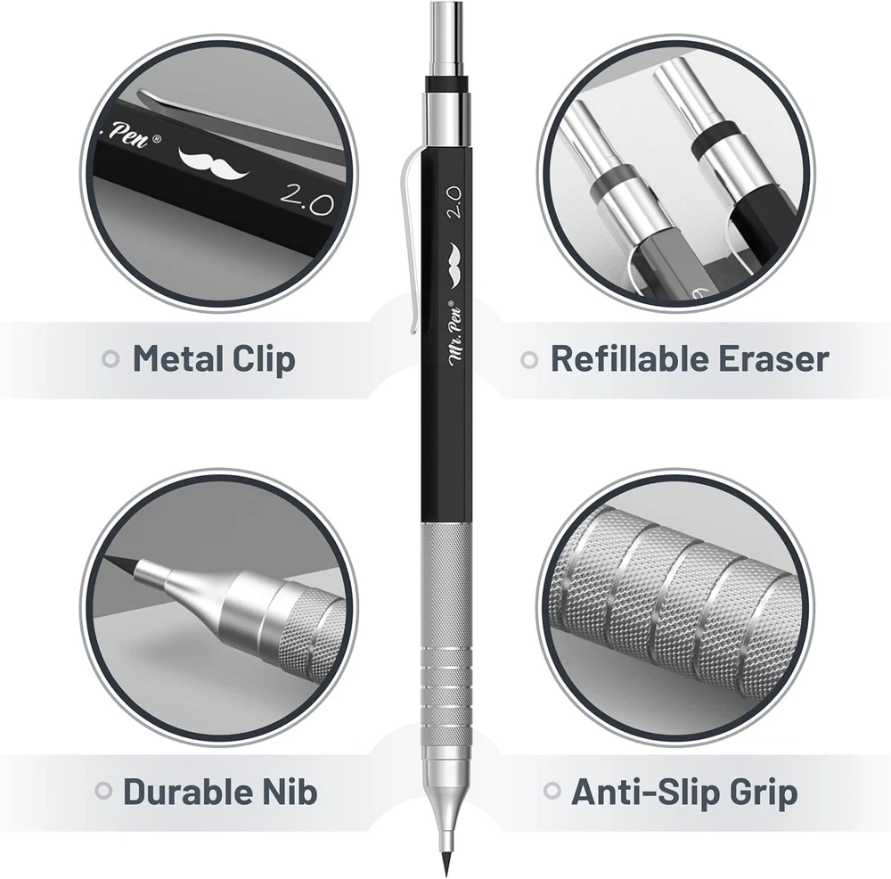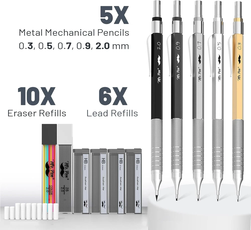 Mr. Pen metal mechanical pencil set includes 5 quality pencils in 5 sizes: 0.3, 0.5, 0.7, 0.9, and 2.0 mm; a set of 5 HB lead refills of each size, 1 tube of 2.0mm colored lead refills, and 10 eraser refills. Each pencil has a comfortable grip for hours of writing comfort! The mechanical pencil is made of high-quality material. The body provides ideal weight balance for fatigue-free writing and drawing. Our mechanical pencil set is ideal for school or office use! The set comes packaged in a reusable box with an easy-to-close lid to keep the pencils organized and protected from damage when not in use! Mr. Pen mechanical pencils set is perfect for everyday use. They are also great for art and technical drawing. The lead is very durable and will not break easily, making them a great choice for artists and professionals. This mechanical pencil set by Mr. Pen is perfect for anyone, from architects and artists to students, teachers, and engineers. With 5 different pencil tip sizes, it's the ideal tool for any project. Product Description 1 Features 2 Variety Of Lead Sizes 3 Easy Storage Are all the different-sized leads black? All the pencils have black lead, but the 2 mm pencil has both black and colored lead refills. Are the erasers latex-free? Yes Mr. Pen Mechanical Pencil Set Add to Cart Add to Cart Add to Cart Add to Cart Add to Cart Add to Cart Add to Cart Customer Reviews 4.6 out of 5 stars 404 4.6 out of 5 stars 7,846 4.6 out of 5 stars 7,846 4.6 out of 5 stars 7,846 4.7 out of 5 stars 345 4.5 out of 5 stars 361 4.6 out of 5 stars 5,951 Price $14.99 $ 14 . 99 $7.99 $ 7 . 99 $7.85 $ 7 . 85 $7.85 $ 7 . 85 $6.99 $ 6 . 99 $5.99 $ 5 . 99 $9.99 $ 9 . 99 Body Material Metal Plastic Plastic Plastic Plastic Plastic Metal Lead Size 0.3, 0.5, 0.7, 0.9, and 2.0 mm 0.3, 0.5, 0.7, 0.9, and 2.0 mm 0.3, 0.5, 0.7, 0.9, and 2.0 mm 0.3, 0.5, 0.7, 0.9, and 2.0 mm 0.5 and 0.7mm 0.7 mm 0.3, 0.5, 0.7, 0.9, and 2.0 mm Eraser Refills 10 Pcs 10 Pcs 10 Pcs 10 Pcs 8 Pcs 8 Pcs 10 Pcs Lead Refills 6 Tubes 5 Tubes 5 Tubes 5 Tubes 6 Tubes 4 Tubes 6 Tubes Body Color Silver Vintage Colors Pastel Colors Bright Colors Boho Colors Cute Mild Colors Silver Comes in a Storage Case ✔ ✔ ✔ ✔ ✔ ✔ ✔