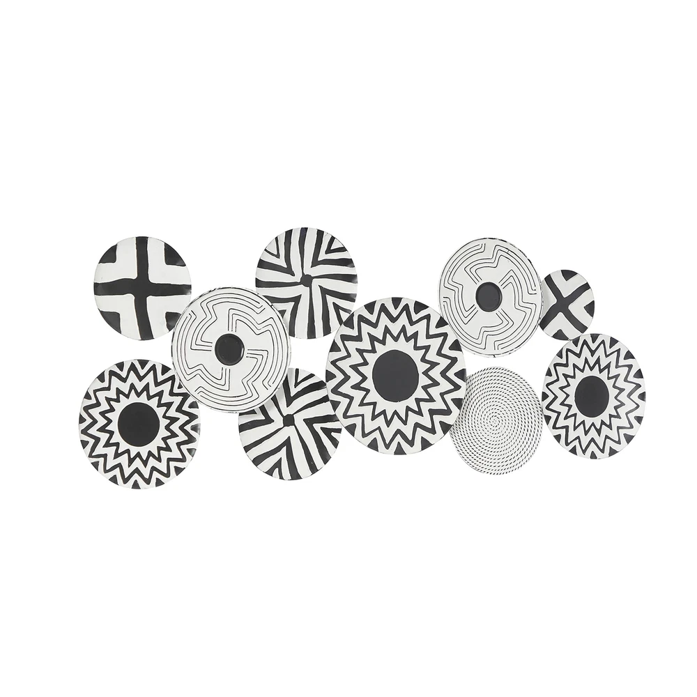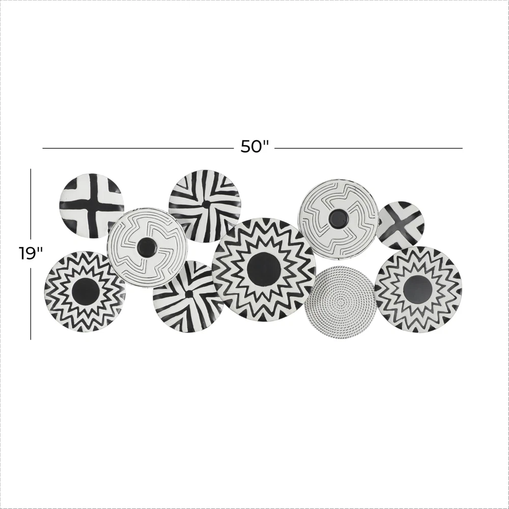Each plate in this contemporary room wall decor is meticulously crafted with various paint patterns welded together to form irregularly shaped silhouette. Matte black wall art for living room has an intriguing irregular shape, consisting of ten-disc structures adorned with pattern prints. Wipe clean with a dry cloth. As a plate wall sculpture, it serves as a suitable accent piece for corners needing a touch of pattern or modern flair. This item ships in 1 carton. Can be hung horizontally or vertically using the metal rings; nails and screws not included. Suitable for indoor use only. This item ships fully assembled in piece. This is a single black colored wall sculptures. Contemporary style. CONTEMPORARY DECOR FOR WALL: Embrace artistic expression with a style that highlights bold designs with sleek lines, neutral elements, and a minimalist aesthetic METAL WALL HOME DECOR: Crafted from solid iron, the black home wall decor is both durable and visually striking BLACK AND WHITE WALL ART FOR LIVING ROOM: Round decor for wall presents an elegant matte black finish, with each disc carrying a unique black and white color scheme PLATE ROUND ROOM WALL DECOR: Iron wall decor features a cluster of monochrome plates in an overlapping arrangement, offering an abstract yet contemporary appeal SMALL SIZE WALL ROOM DECOR: The black metal wall decor measures 50L x 1W x 19H inches, and weighs 4 lbs