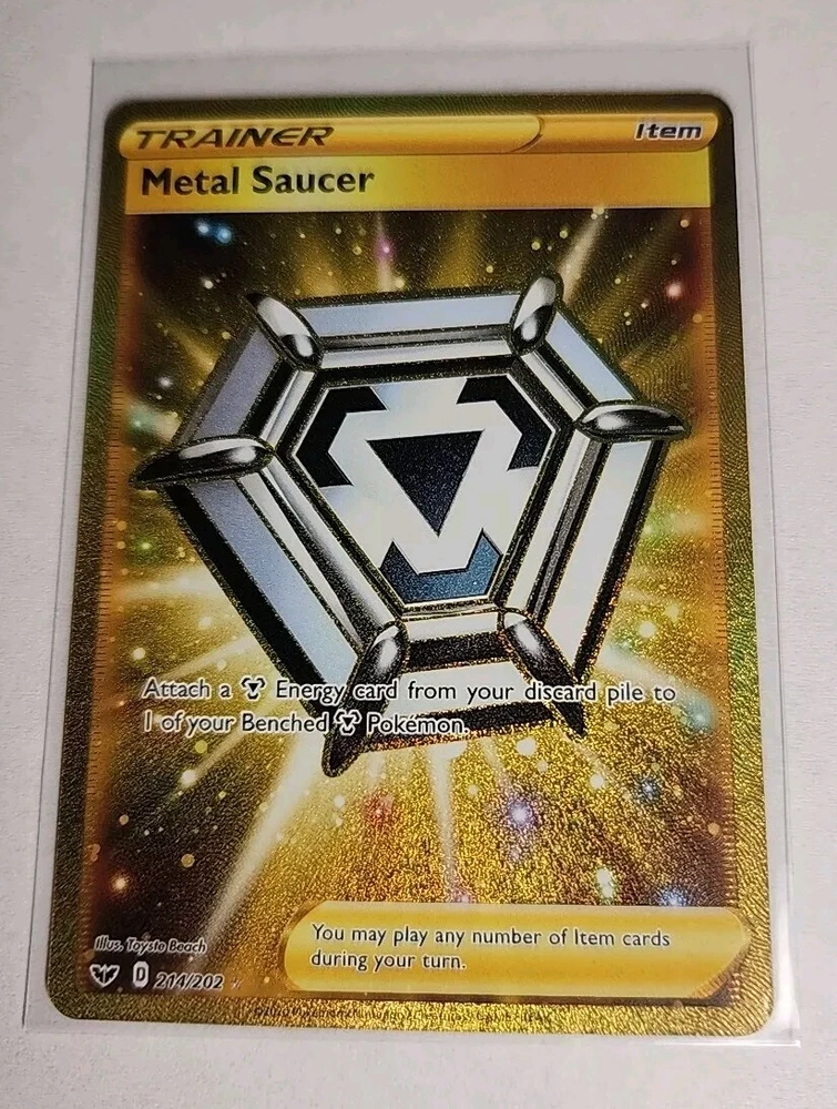 This amazing Gold Secret Rare Metal Saucer Trainer card is a must-have for any serious Pokémon TCG collector. With its stunning design and rarity, this card is sure to be a showpiece in your collection. It comes from the 2020 Sword & Shield set and features the card number 214/202. This Trainer-Item card is perfect for enhancing your gameplay and can be a valuable addition to your deck. It is a great opportunity to own a piece of Pokémon history and show off your love for the game. Don't miss out on this chance to add this rare and sought-after card to your collection.