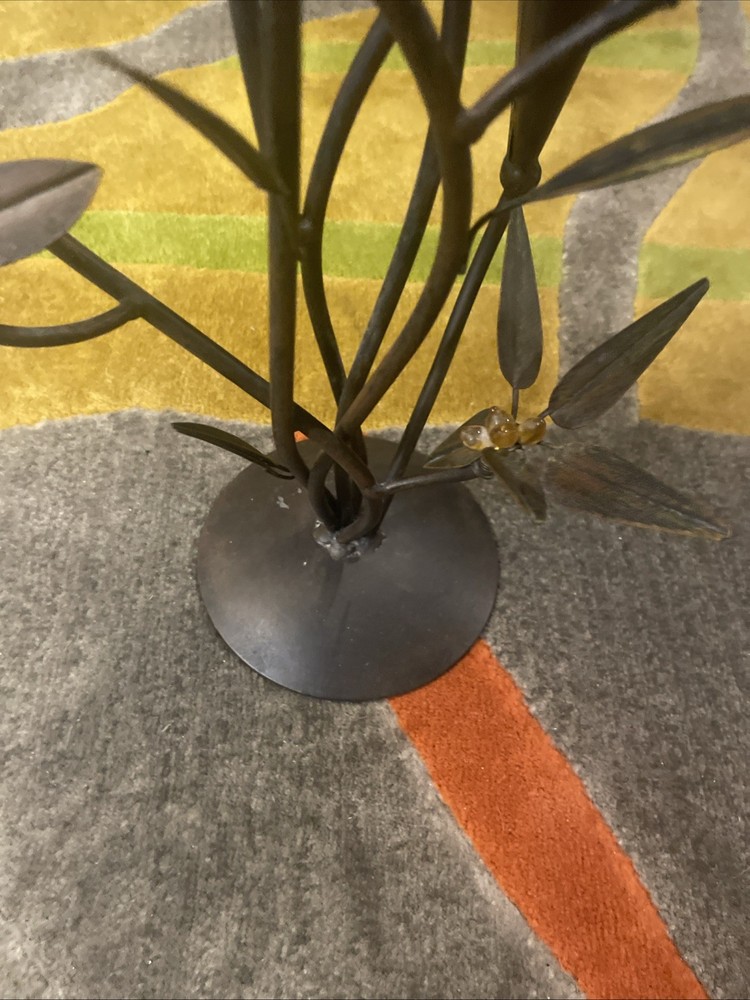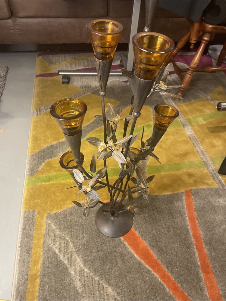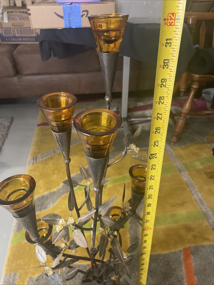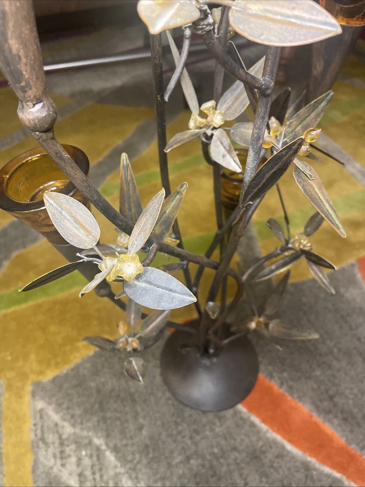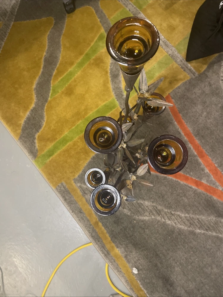 I know as much about this as you can see in the photos. Very faint chipping in a few of the tea light glass rims. NO cracks in glass. All branches feel sturdy and secure. A couple glass flowers have been glued back on. Believe this is from the 70’s or 80’s. Overall great shape.