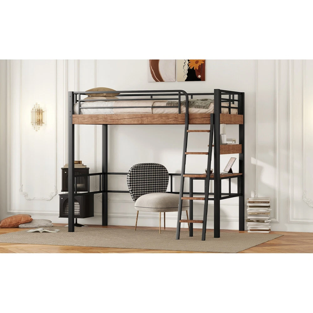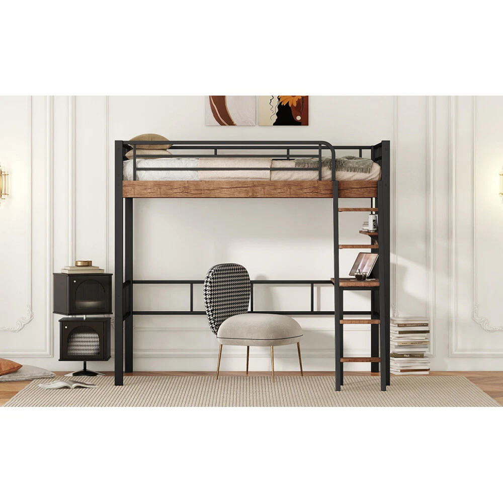 [Sturdy Metal Frame] Strong metal frame that includes an integrated ladder, full-length guardrails and secured metal slats to ensure security and stability. No additional box spring or foundation required. [Space Saver] Desk, storage shelf and bed three in one, this loft bed is ideal for space-saving needs. There's plenty of room for user customization of the area underneath.Perfect dorm or guest room, or any other limited floor space. [Safety for Kids] It comes with secured metal slats, the ladder attaches to the bed and top bed includes full-length guardrails for added safety. [Multifunctional Design] In addition to the sleeping and storage space, the built-in desk with shelf provides you with a place to work or do homework. The shelf provides extra storage space. [No Box Spring Required] The wood slats support the mattresses not to slide and increase the service life. Metal Twin Size Loft Bed with Built-in Desk, Storage Shelf and Ladder, Black Modern and industrial, this loft bed with desk has the space-saving functionality you are looking for to maximize your bedroom. This loft bed is designed with a full-length metal desk surface, making it the ideal spot for you to do their personal works.The desk can be used to store study supplies or to give the room some personalized touches by adding some funky accessories. This loft bed is built with a strong metal frame that includes an integrated ladder, full-length guardrails, and secured metal slats to ensure that you will sleep in complete security and stability. What's more, you don't need to purchase any additional box spring or foundation. Description Material Pine Wood+MDF Size Twin Color Black Numbers of Package 2 Spring Box No need Assembly Required Yes Dimensions Overall Product Dimension 78.7''L x 57.8''W x 69.3''H Package Dimension Please refer to the Specification Twin Bed 76'' x 39.2'' Total Height 69.3'' Number of Bed Slats 20pcs Recommend Mattress Thickness of Bed 6'' Overall Product Weight 123lb Bed Weight Capacity 250lb