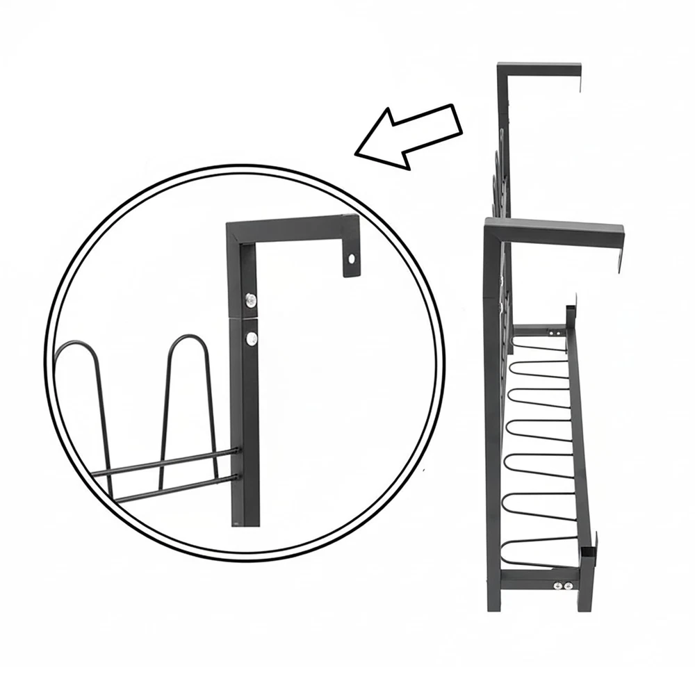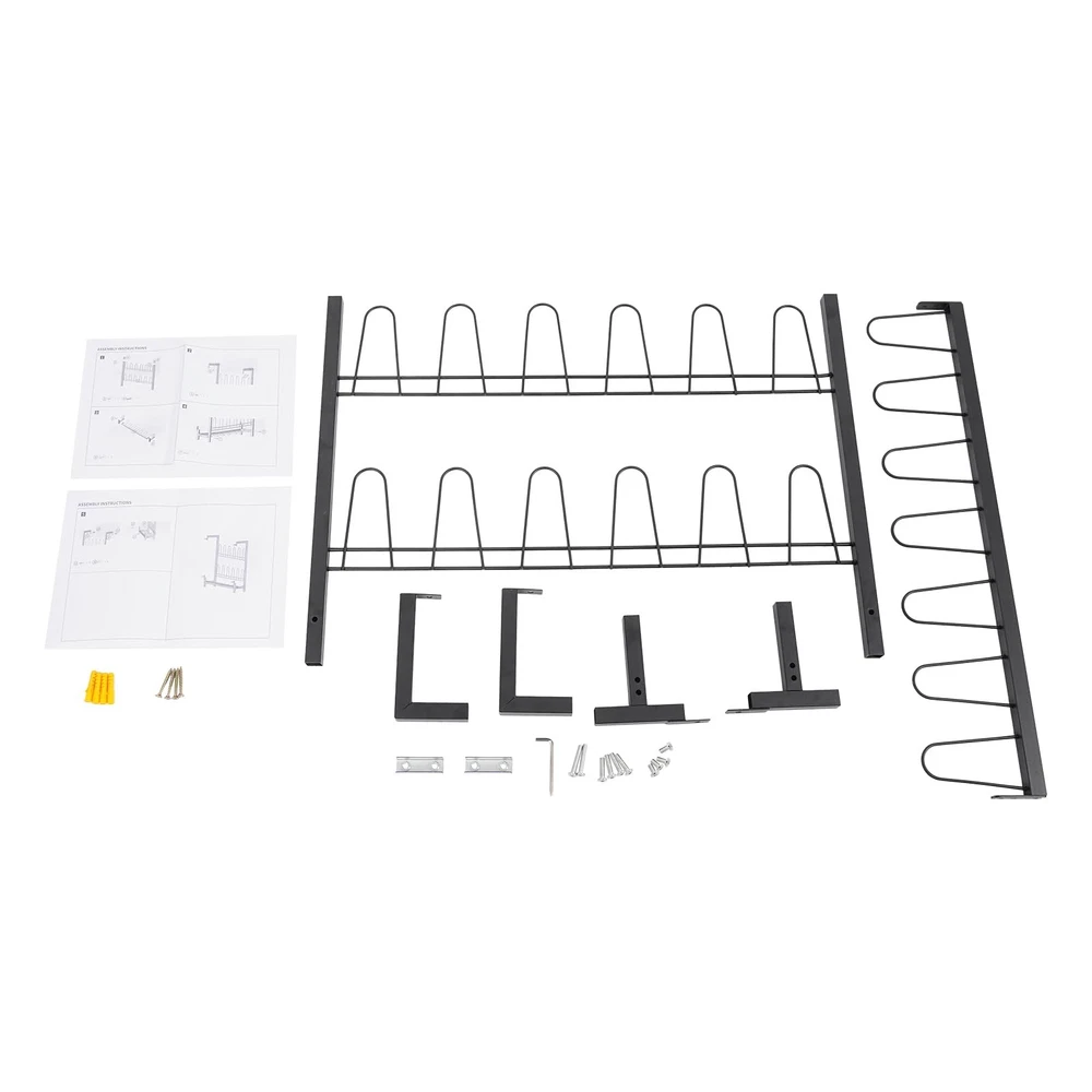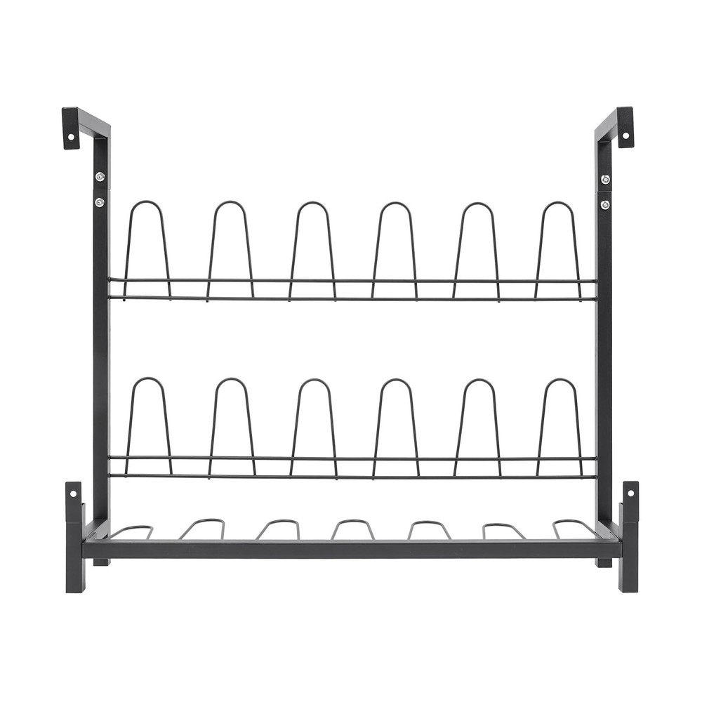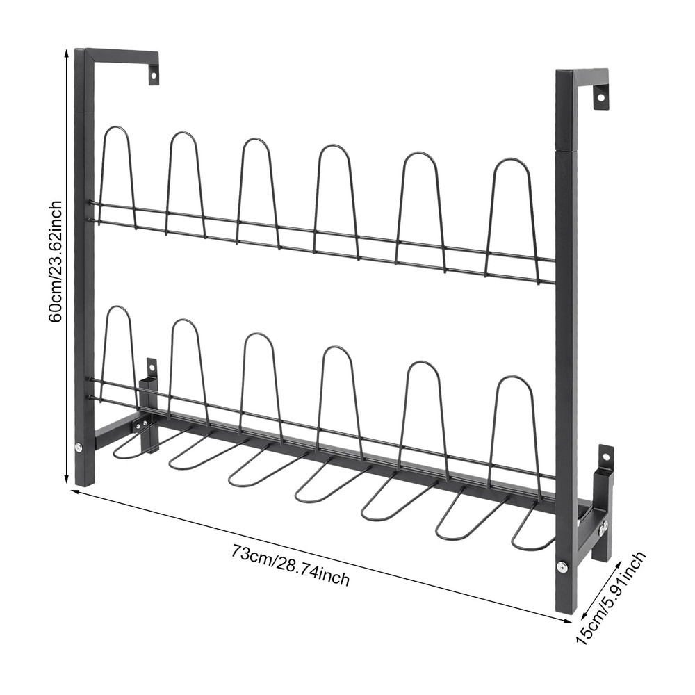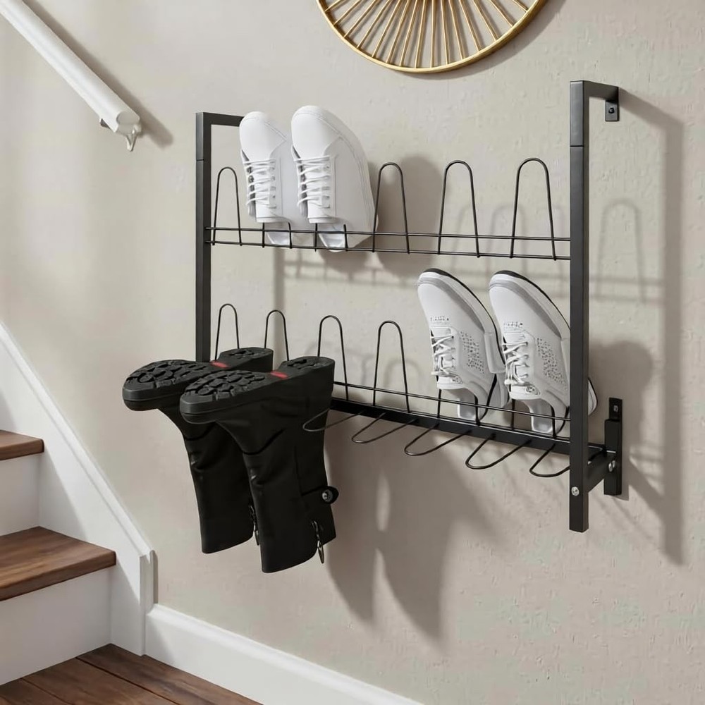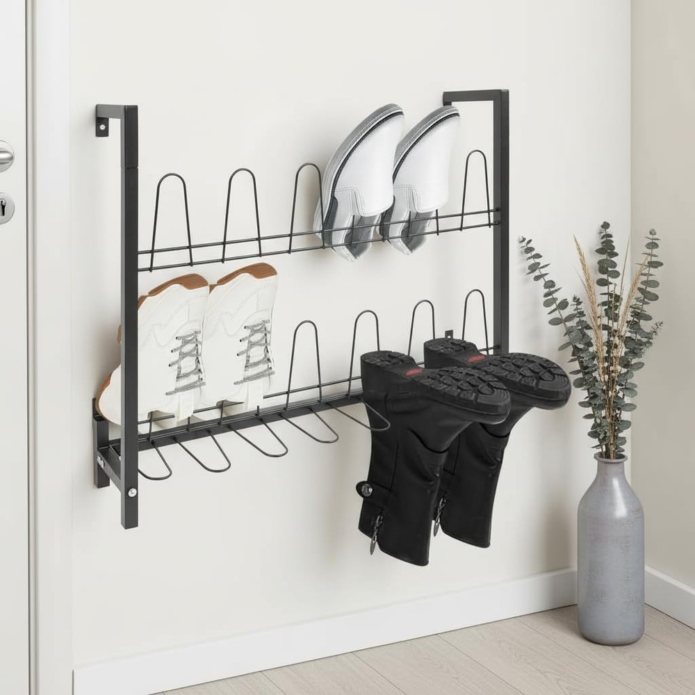 Details Curved Hooks: They will cradle your various types of shoes gently and make it easy to hang and remove while protecting your footwear from scratches. Reserved Holes: They facilitate your quick installation and save drilling time. Application It is suitable for living rooms, bedrooms, cloakrooms, entryways, garages, attics, and more to store various kinds of flat shoes, sports shoes, boots, high heels, canvas shoes, casual shoes, and so on. Specification Color: Black Style: Modern Shape: Rectangle Material: Iron Process: Spraying Assembly Required: Yes Mounting Type: Wall Mounted Number of Tiers: 3 Capacity: 9 Pairs of Shoes Overall Load Capacity: 20 kg / 44.09 lbs Product Size: 73 x 15 x 60 cm / 28.74 x 5.91 x 23.62 in Package Size: 75 x 15 x 10 cm / 29.53 x 5.91 x 3.94 in Gross Weight: 3.5 kg / 7.72 lbs Net Weight: 3.33 kg / 7.34 lbs Package Included 1 x Shoe Rack 1 x English Assembly Diagram Other Accessories for Assembly Notes Please check the product's size before ordering. Please note that our package does not include shoes. Sturdy Metal Material: Crafted from high-grade iron with anti-rust spray coating, this metal shoe organizer resists corrosion, scratches, and deformation. Supports up to 44 lbs (20kg), ensuring reliable storage for multiple pairs of shoes 3Tiers Large Capacity - Holds 9 Pairs of Shoes: Maximize storage with 18 curved hooks across 3 tiers, neatly organizing flats, sneakers, heels, and boots. The wall-mounted shoe rack saves floor space while keeping footwear visible and easily accessible Secure & Gentle on Shoes: Features curved hooks to prevent slipping and protect shoes from scratches. Hanging storage improves airflow, reducing moisture and odor buildup for fresher footwear Quick Assembly & Easy Maintenance Includes all hardware and clear instructions for fast setup. Smooth surface wipes clean in seconds—no complicated upkeep! Buy with confidence: Backed by hassle-free customer support Approximate Dimensions: 28.74" L x 5.91" W x 23.62" H, Wall Mounted Shoe Rack is ideal for home and retail use for storing footwear in a place that is easy to access and view