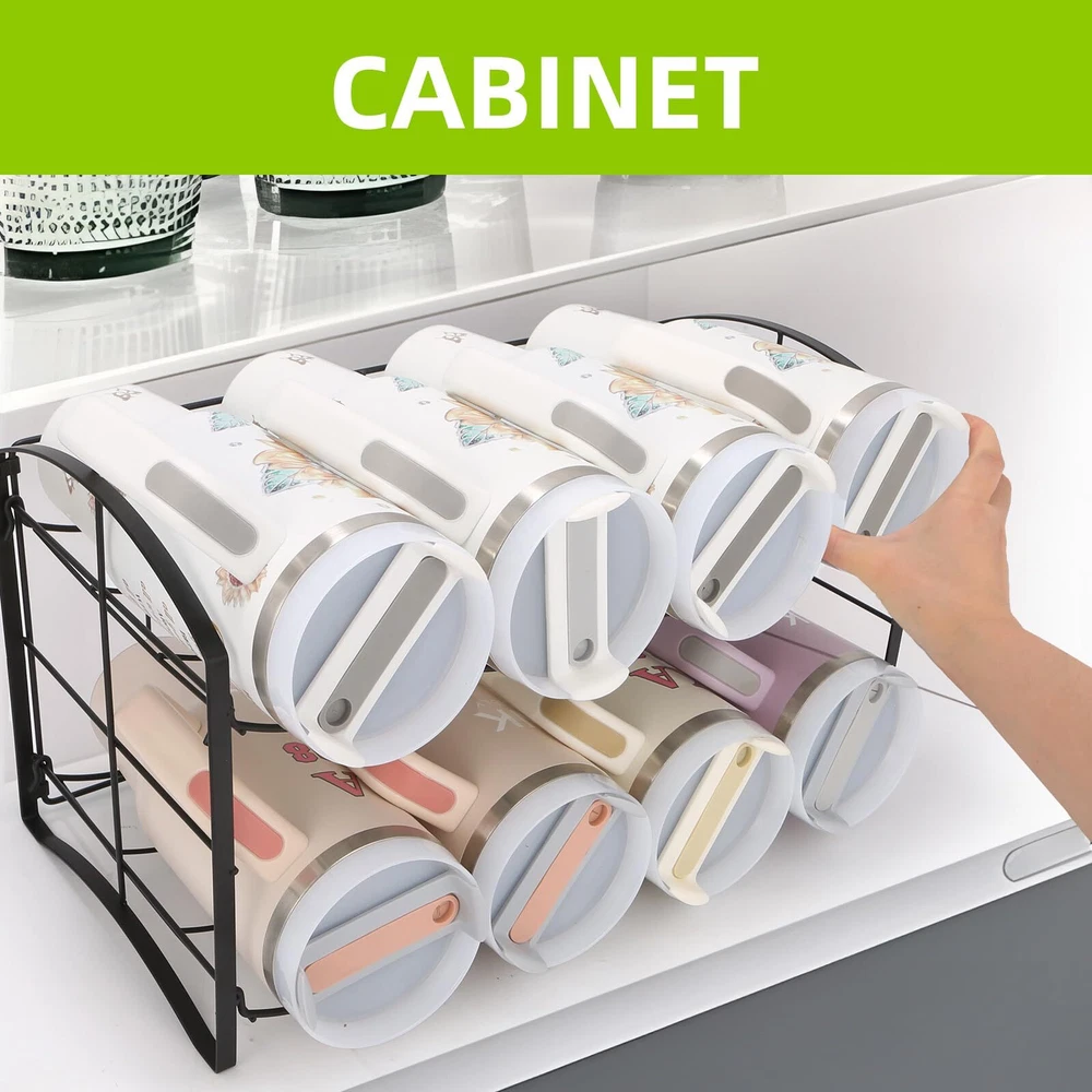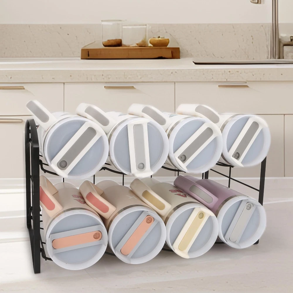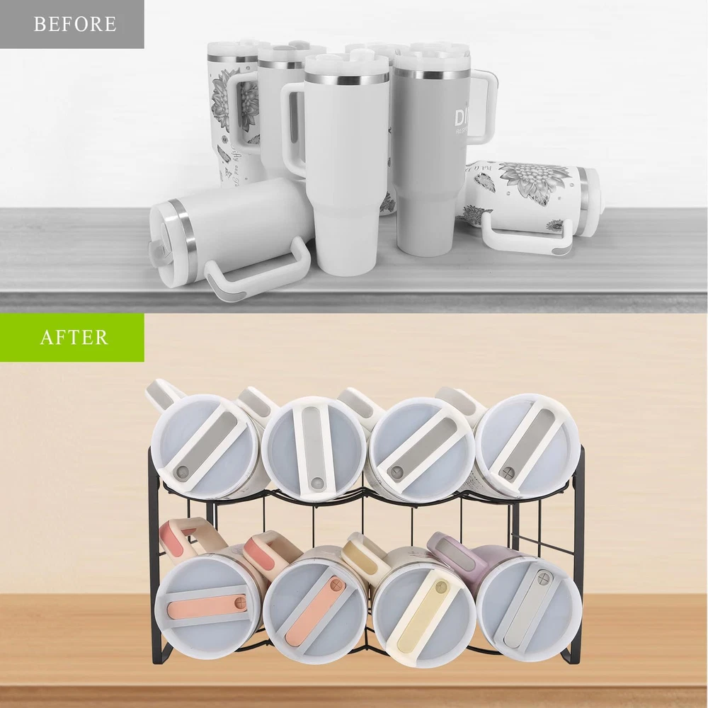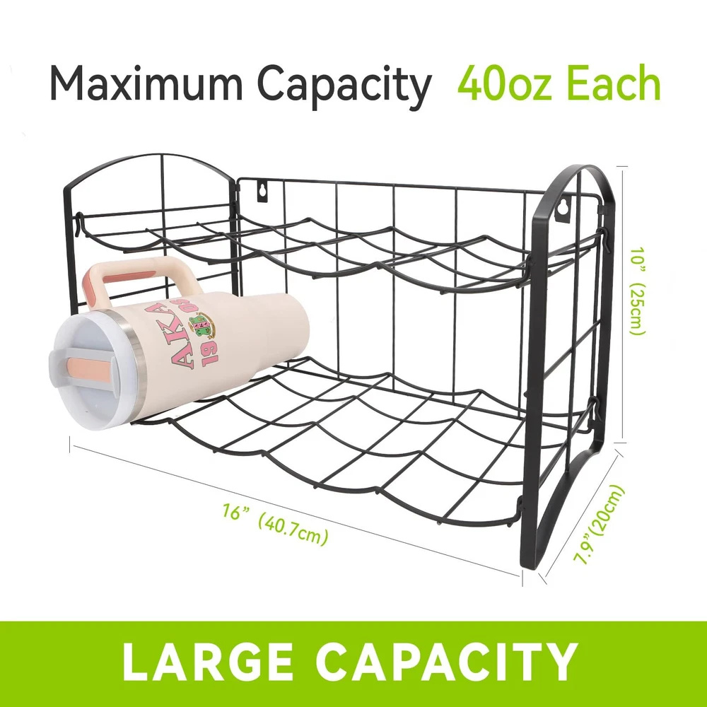 Water bottle organizer: Our water bottle storage rack has 2 layers, each layer can hold up to 4 40oz water bottles, and is equipped with 2 cup lid hooks. It can save desktop space and is very suitable for storing Stanley water bottles, wine bottles, children's milk bottles, sports water bottles, and shake bottles. Perfect design: The curve design can more perfectly place Stanley water bottles, wine bottles, and sports water bottles without shaking. The hook design can place cup lids, brushes, etc. Iron metal material: The entire water cup storage rack is made of metal, making it more sturdy and more load-bearing. Durable is the only choice for storage racks. Multifunctional storage organizer: Our water bottle storage rack is very suitable for places with limited space. It is suitable for adding vertical storage space in various environments such as kitchen countertops, food storage rooms, cabinets, refrigerators, bathrooms, study rooms, and utility rooms. Good choice of water bottle organizer: Not only is the material made of metal anti-rust and stronger load-bearing, but the overall design is closer to the water bottle itself. If you have any questions during use, please contact us in time.