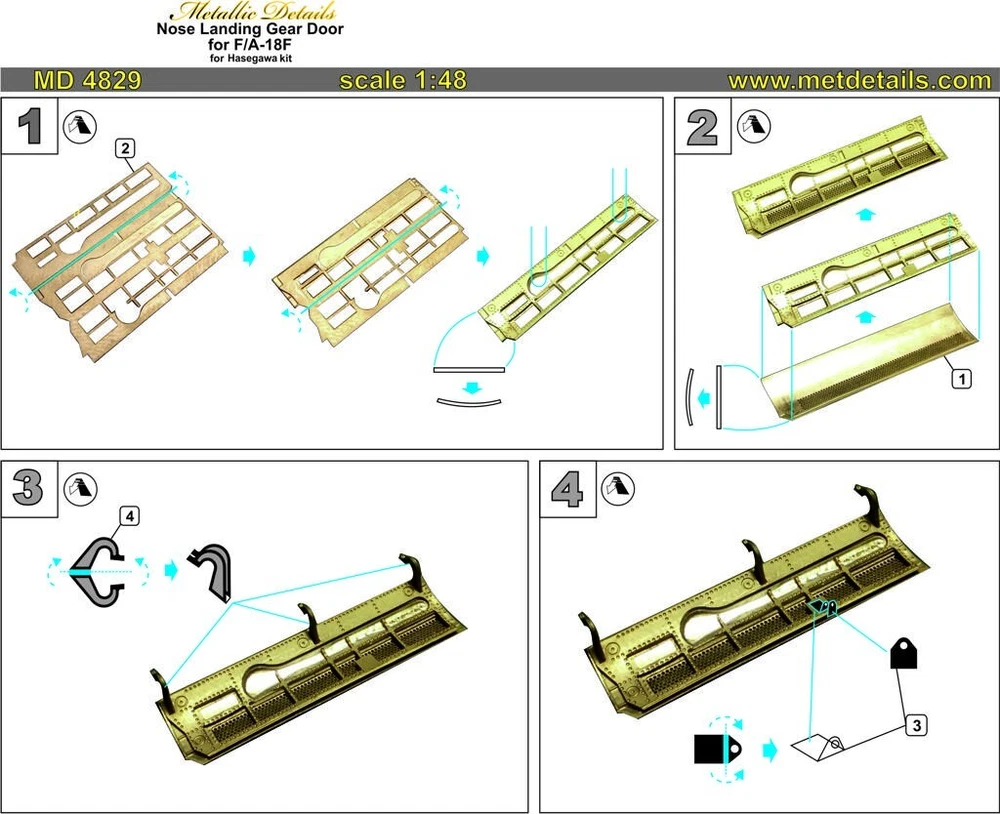 MD4829 F/A-18F. Nose landing gear door Scale: 1:48 Manufacturer: Metallic Details (Ukraine) Country/Region of Manufacture: Ukraine Paint: Unpainted, Unassembled, Kit do not contain paints and glue. Condition: New in Box Features: Kit Set contains photoetched board (38*35 mm) for detailing nose landing gear door. "The Boeing F/A-18F Super Hornet - twin-engine tandem-seat carrier-capable multirole fighter aircraft designed and initially produced by McDonnell Douglas. Produced: 1995 – present. Operators: Australia, United States." The figures are not painted!!! ----------- This is a plastic model kit. Assembly and painting is required. Paint and glue is NOT included. Item Type: Scale model kit Commodity Attribute: Assembly The model is a plastic assembly model and needs to be assembled and painted by yourself You need an extra purchase of the glue, paint and so on!