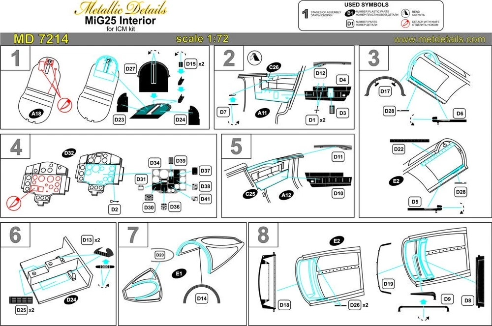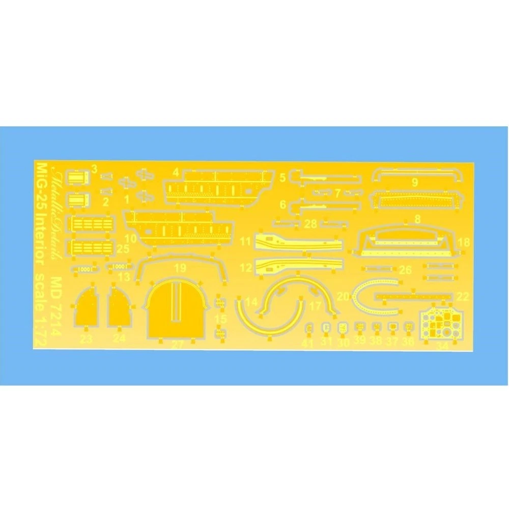 MD7214 MiG-25. Interior Scale: 1:72 Manufacturer: Metallic Details (Ukraine) Country/Region of Manufacture: Ukraine Paint: Unpainted, Unassembled, Kit do not contain paints and glue. Condition: New in Box Features: Kit Set contains photoetched board (66*28 mm) for interior detailing for aircraft models MiG-25. "The Mikoyan-Gurevich MiG-25 (NATO: Foxbat) - a supersonic interceptor and reconnaissance aircraft. Produced: 1964-1984. Operators: Algeria, Armenia, Bulgaria, Belarus, India, Georgia, Kazakhstan, Libya, Russia, Turkmenistan, Ukraine." The figures are not painted!!! ----------- This is a plastic model kit. Assembly and painting is required. Paint and glue is NOT included. Item Type: Scale model kit Commodity Attribute: Assembly The model is a plastic assembly model and needs to be assembled and painted by yourself You need an extra purchase of the glue, paint and so on!
