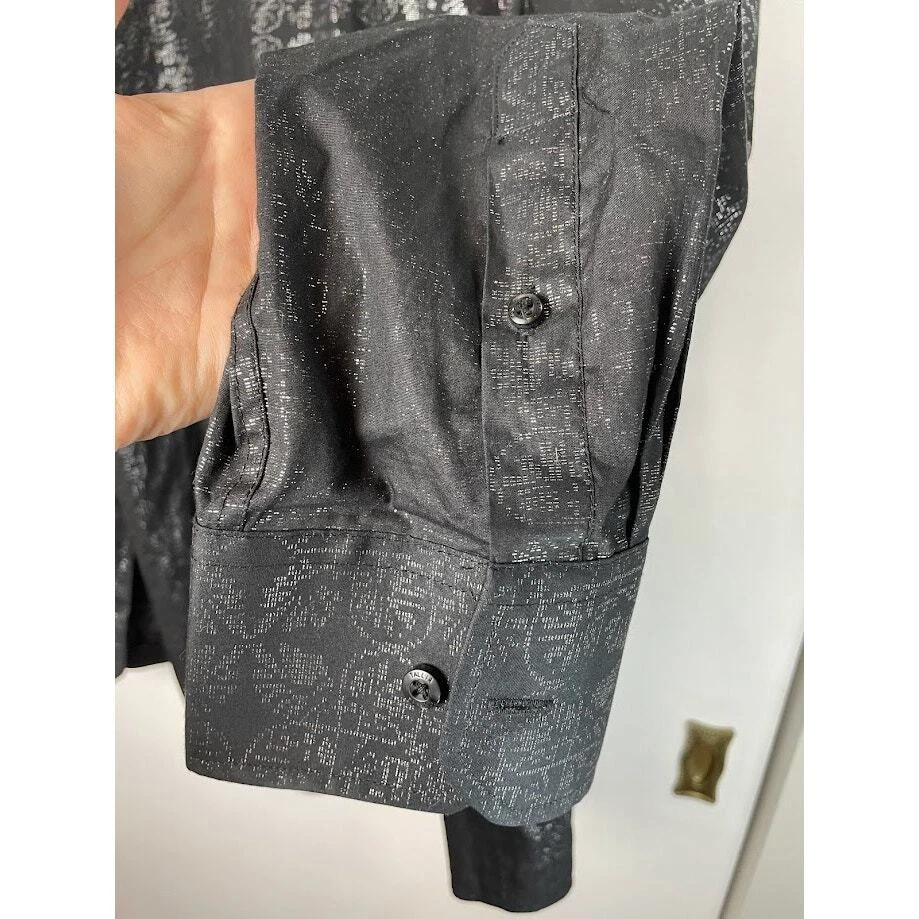Metallic Dress Shirt Mens Black Evening Button Up Long Sleeve Night Out Size 2XL 18 1/2 Pit to Pit 26.5" Length 30" 100% Cotton Black with silver print Very Good Condition no known Flaws Retro, party shirt, regencycore, club night,
