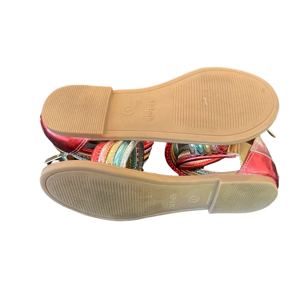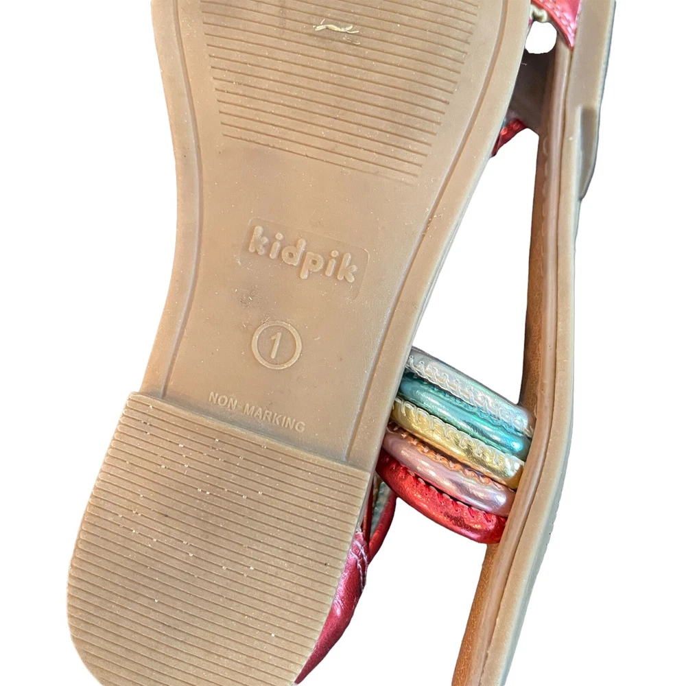 UPC:Does not applyType:SandalHeel Height:Flat (Under 1 in)US Shoe Size:1Upper Material:Faux LeatherStyle:StrappyColor:rainbowFeatures:Ankle Strapgtin13:Does not applyAccents:ZipperDepartment:GirlsModel:sandalsBrand:KidpikSeller Notes:“Excellent condition. Worn only a couple of times.”Theme:ColorfulClosure:Zip