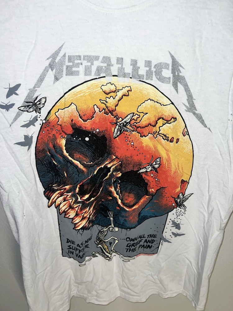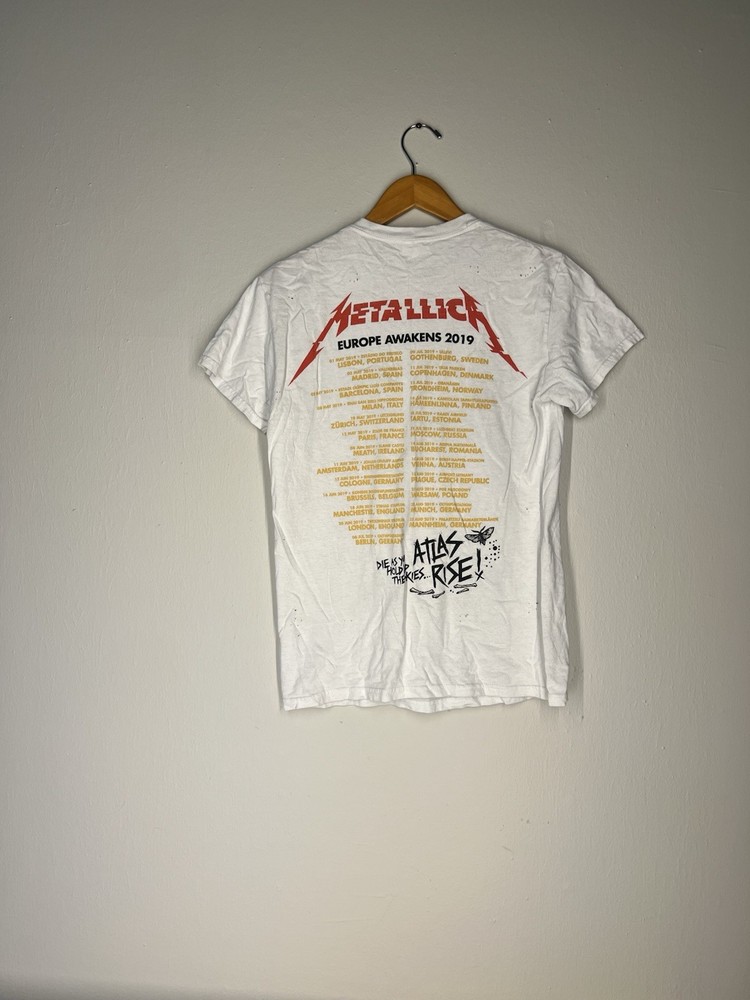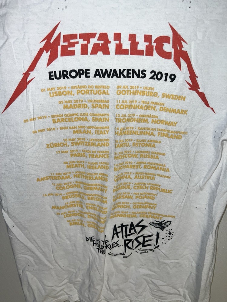 Vintage 2019 Metallica tour graphic tee with front skull “Atlas Rise” design and full Europe tour dates on back. Soft fitted S-rise style from Gildan, perfect for band teeCollectors and streetwear layering. See photos for details. #Metallica #BandTee #TourShirt #MetalFashion #GildanHeavyCotton