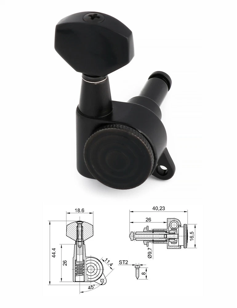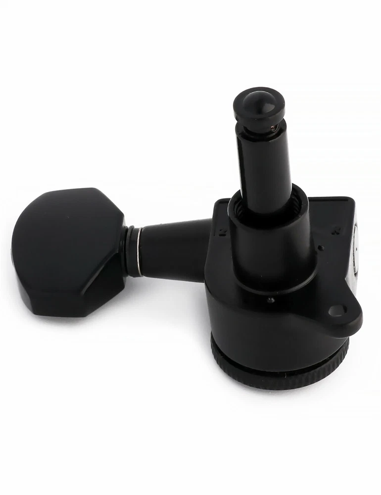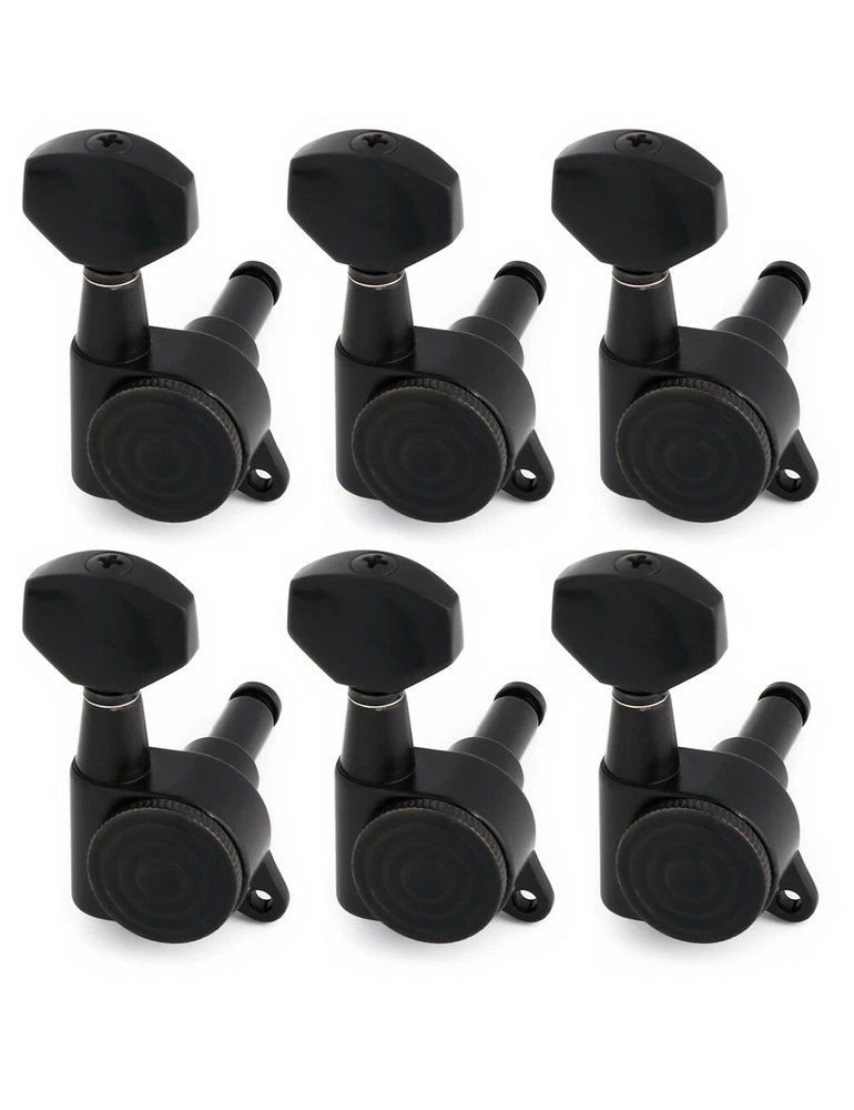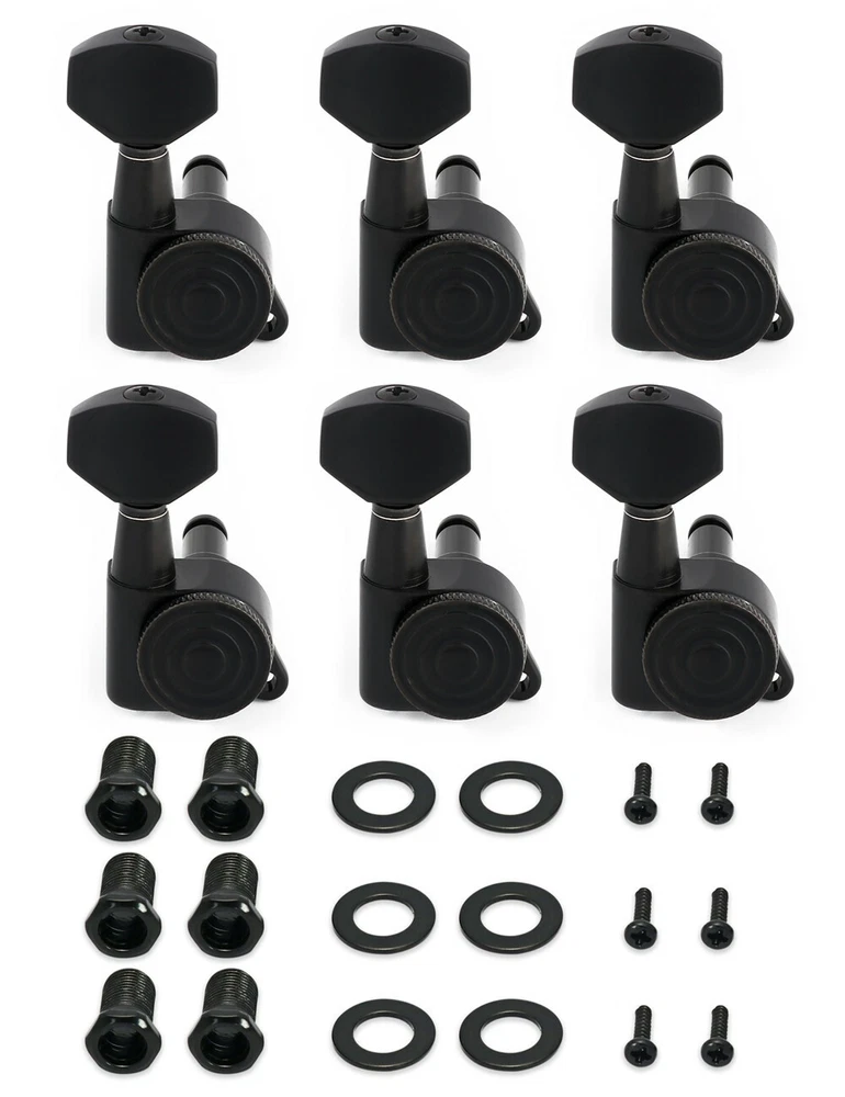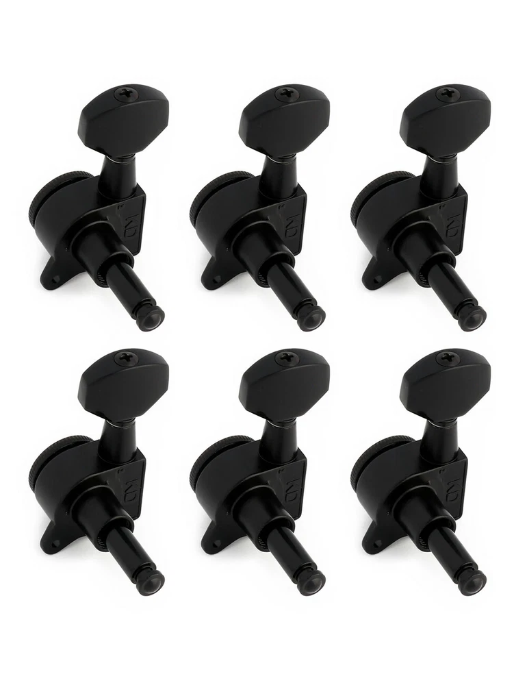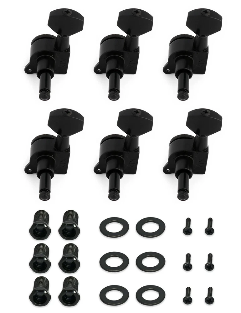 Product description Color: Black Material: Zinc alloy Gear material: Copper Gear Ratio: 1:14 This Locking guitar tuning pegs is proven to hold strings tightly, allowing the guitar to stay in tune to improve playing enjoyment. Durable and highly reliable for easy, smooth and precise tuning. The locking tuners has a mechanical type locking system that can be used on any guitar, including non-tremolo or acoustic. Upgrade your tuners and improve the tuning accuracy and stability of your guitars. They are a 1:14 gear ratio for smooth turning. Locking tuners are in our experience great for providing maximum tuning stability. Package Include 6 x Locking Machine Heads(6 Right) 6 x Ferrules 6 x Threaded bushings 6 x Screws Metallor Parts is a branch of Sunsmile Group, which has had over 20 years of experience in the musical instrument field. We are the leading company in China that can supply a full range of guitar parts, such as hardware, pickups and pickguards etc. Our precise production equipment and experienced staff assure you of the finest quality parts. Cooperating with guitar manufactures, our parts are widely used on famous guitars. Musicians, repairers, luthiers and factories deserve Metallor's quality parts and professional service.