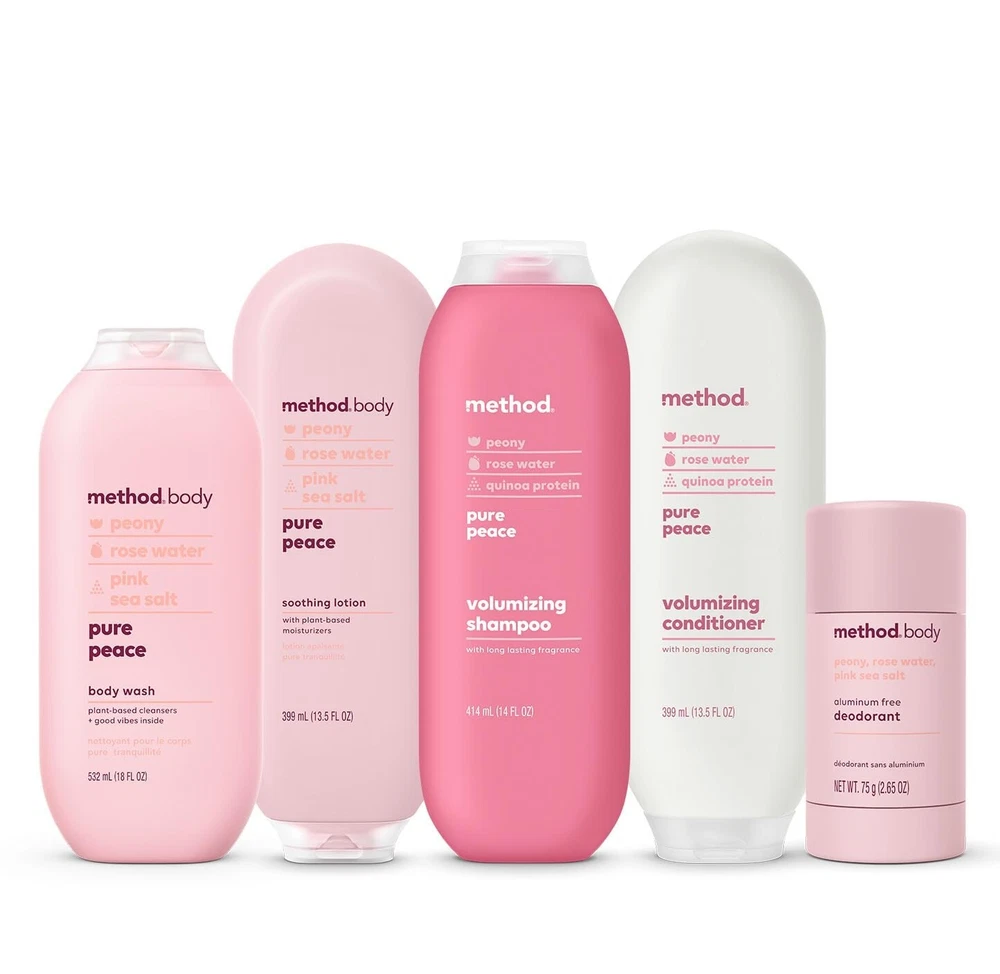 Contains (1) 28 ounce bottle of gel liquid body soap. Infused with peony, rose water plus pink sea salt. Biodegradable formula made with plant-based cleansers. Made with no parabens, no phthalates, no bad vibes. Leaves skin feeling moisturized plus smelling scent-sational. Bottle (minus pump) made of 80% recycled plastic (PCR).