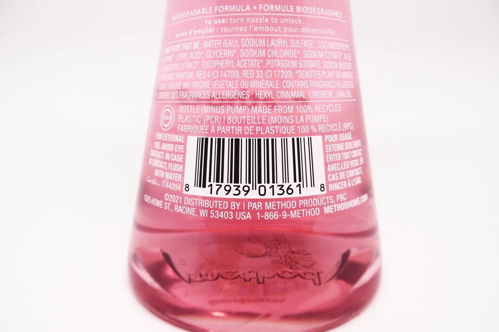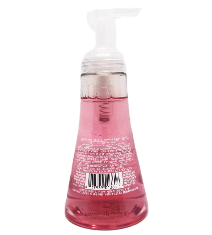 Method Foaming Hand Wash with Plant-Based Cleansers - Pink Grapefruit - 10 fl oz Foamy stuff. It’s just one of those things that everybody likes. Kind of like marshmallows and puppies, but without all the calories and obedience classes. So pump, lather, smile and the next thing you know your hands are soft and clean. What’s not to love? There are certain scents that seem to put an extra spring in your step. Like this refreshing fusion with notes of pink grapefruit, blood orange + cassis. In fact, we wouldn’t be surprised if this vibrant medley induces spontaneous skipping. It’s been known to happen. Features Contains (1) 10 ounce bottle of foaming hand soap Foaming hand wash with plant-based cleansers. Biodegradable formula made without parabens or phthalates. Bottle (minus pump) made from 100% recycled plastic (PCR). Leaves hands feeling soft, clean + sublimely scented. Cruelty free. Tested by people, not on animals. Pink Grapefruit scent is a peppy fusion of pink grapefruit, blood orange + cassis fragrance notes. Proudly doing business with a purpose. Details Product Dimensions: 3.13 x 3.13 x 7.63 inches Item Weight: 0.77 pounds Shipping Weight: 0.77 pounds Manufacturer: Method Item color: Pink Item model number: 817939013618 Item MPN: 00817939013618 Item part number: 00817939013618 Fast & Free Shipping Orders are shipped out within 2-3 business days usually and delivered to your doorstep as quickly as possible. Competitive Pricing Our competitive prices are some of the lowest that you will find on the internet. Rest assured that you're getting a good deal when purchasing from us. 30-day Money Back Guarantee We are committed to making sure that you leave this transaction satisfied. If you're unhappy with the product for any reason, you may return it back for your money-back or a replacement if available within 30 days.