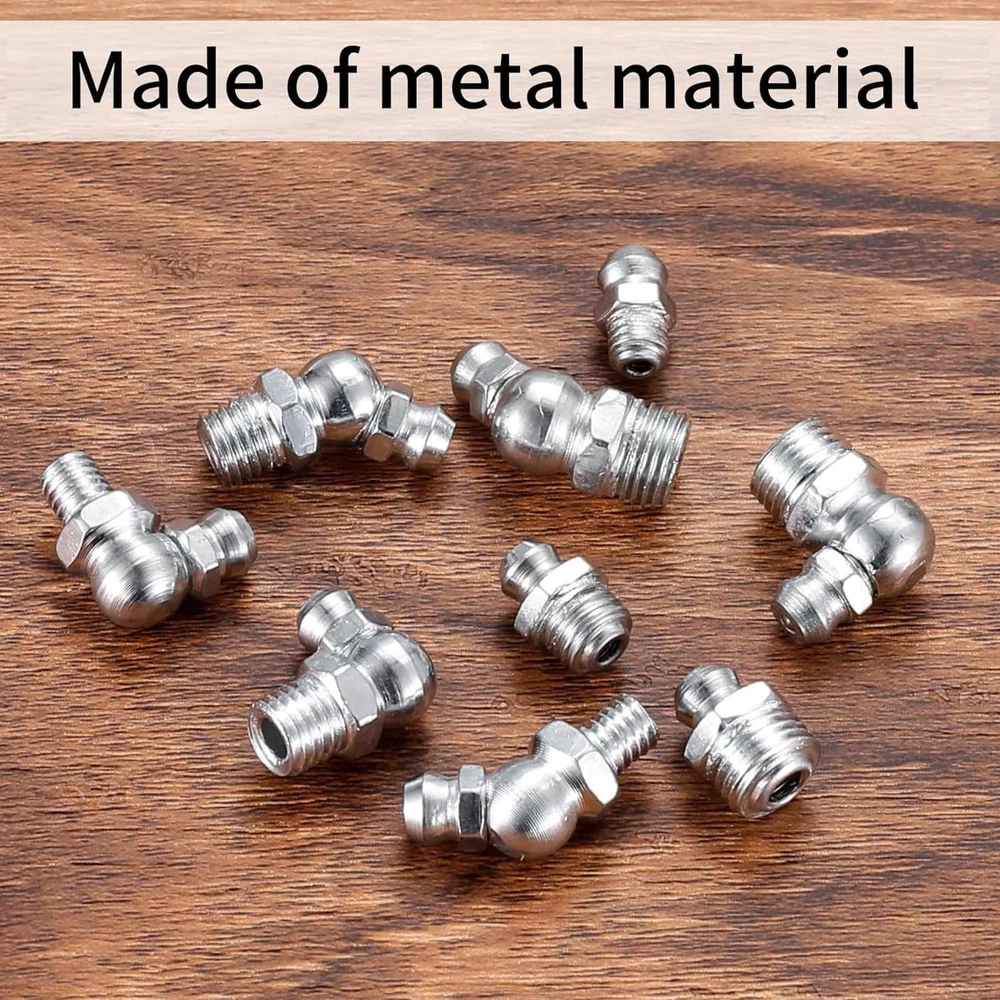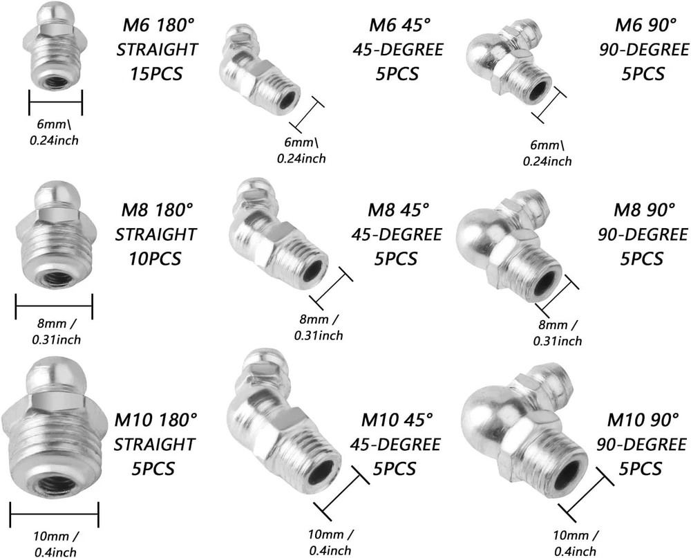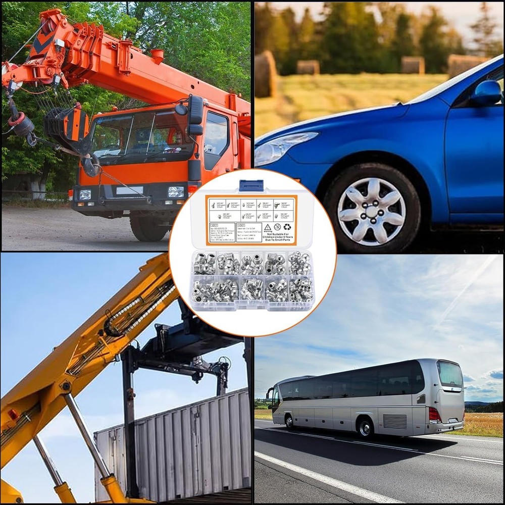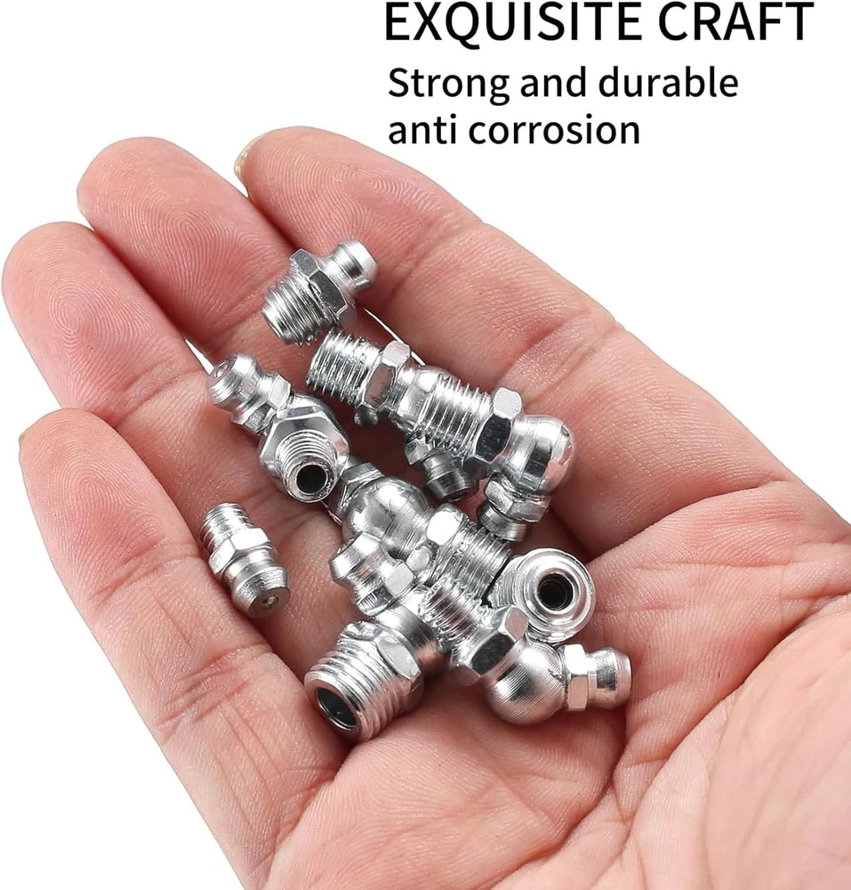 Metric Grease Fittings Kit, 60 Pcs Hydraulic Grease Zerk Assortment Kit Item Description: Exquisite Material: Grease fittings are made of high-quality metal, smooth and burr-free surface, corrosion-resistant and rust-resistant, not easy to break or deform, exquisite workmanship, high hardness, high strength, durable for long-term use. Main Function: Zerk grease fittings can improve the work efficiency in the process of grease gun. Grease fitting assortment can smoothly inject lubricant into the position you need on the bearing, eliminating the trouble of disassembling parts. Easy to Use: The threaded connection of grease zerk assortment is clear, easy to fix and install, good sealing performance, no spillage or leakage. Three angles of 180°, 45°, and 90° can inject lubricating oil into the position you need, and the angle incompatibility problem has been fixed. Multi-scenario Application: Suitable for most cars, motorcycles, trucks, agricultural and industrial applications, etc. Suitable for use in automobiles or other vehicles, for use in mechanical systems and bearings, to provide lubrication points to deliver lubricant to the system or bearings.