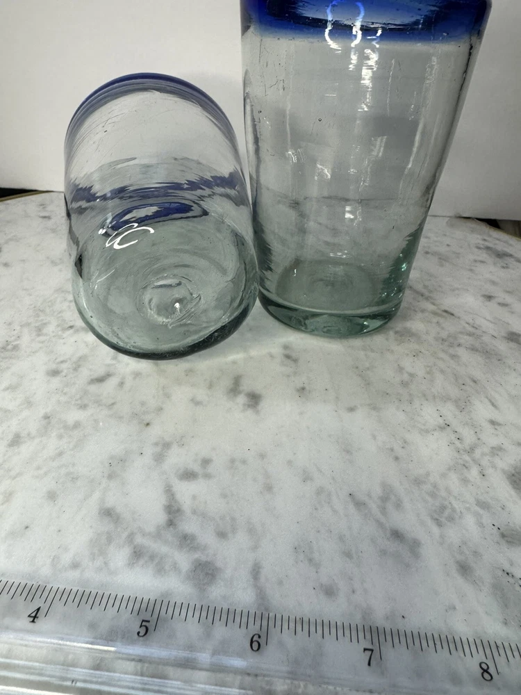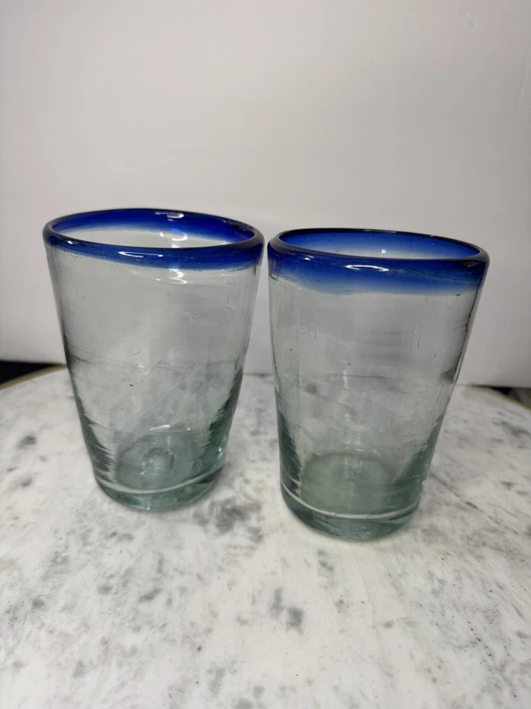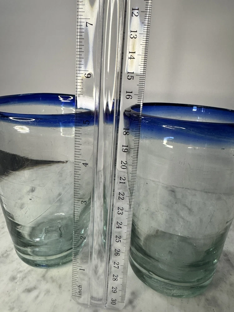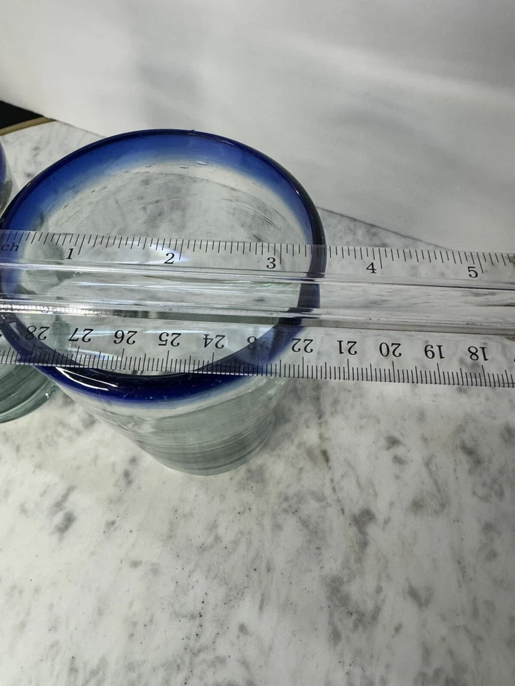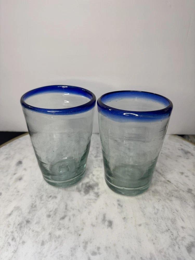 Mexican Hand Blown Tumbler Clear Glass Cobalt Blue Rim 5" Tall 16 oz
