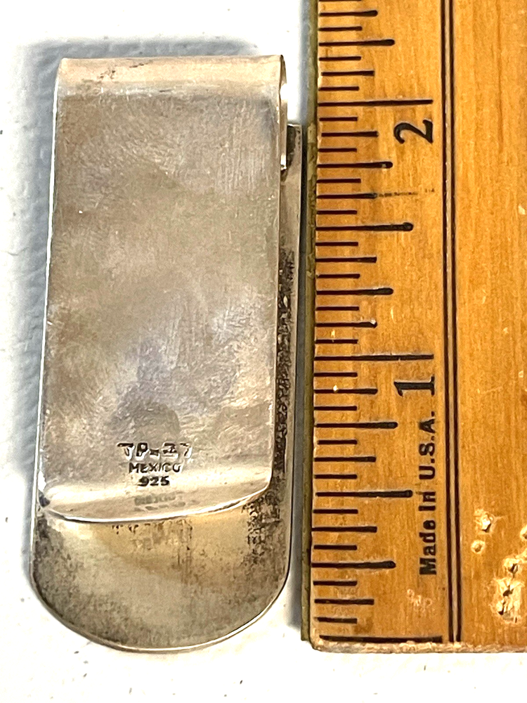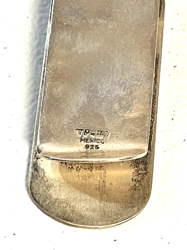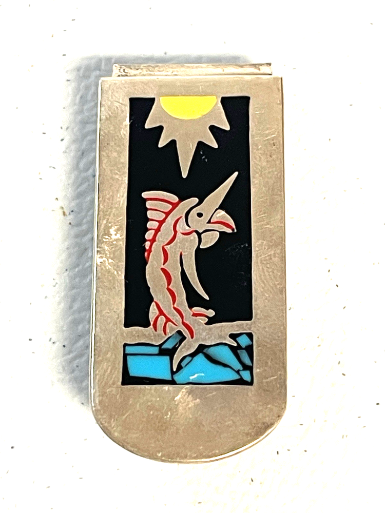 This Mexican Tooled Sterling Silver Gemstone Turquoise Money Clip features a unique fish design, incorporating elements of the sun and water. Made from sterling silver, this vintage accessory is perfect for unisex use and adds a touch of metal style to any outfit. The detailed craftsmanship and use of gemstones make this money clip a standout piece. T hank you for looking. This item is from a smoke free home. Please view all the photos. Check out all my other items.