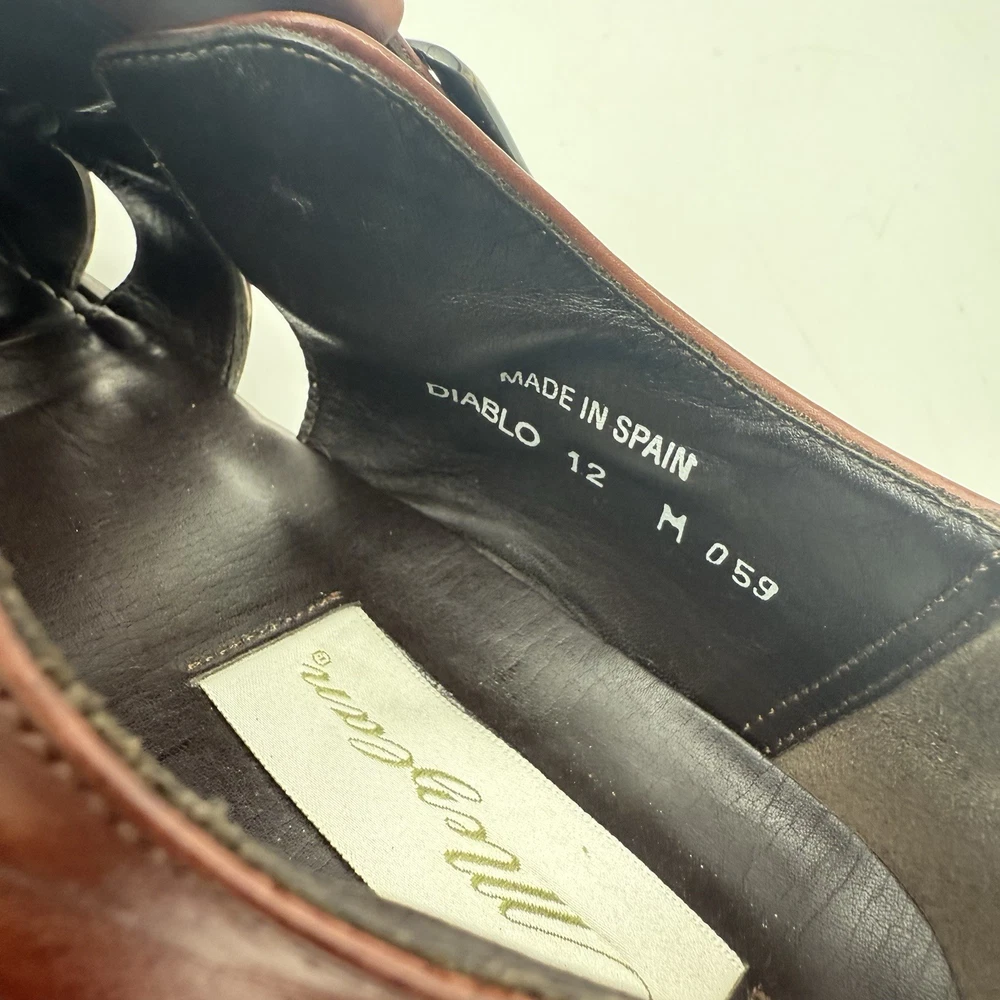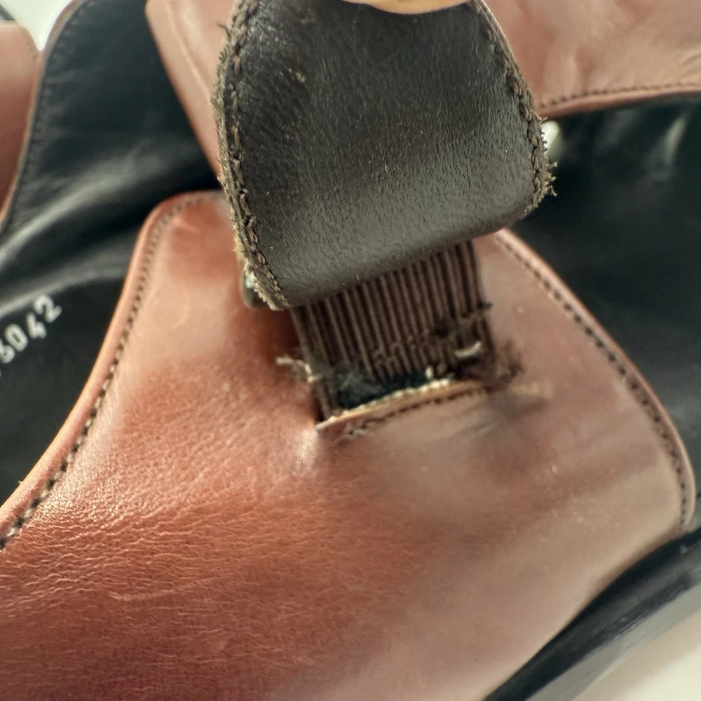 One of the elastic strips on strap has a couple missing threads as pictures. The Mezlan Diablo Mens Brown Leather Fisherman Sandals are a stylish and casual shoe option for men. Made in Spain, these sandals feature a solid brown color with a strap accent. The leather material and comfortable medium width make them perfect for a casual occasion. The dress sandals style adds a touch of sophistication to any outfit, while the fisherman character embodies a rugged and adventurous spirit. Perfect for a man who values both style and comfort in his footwear choice.