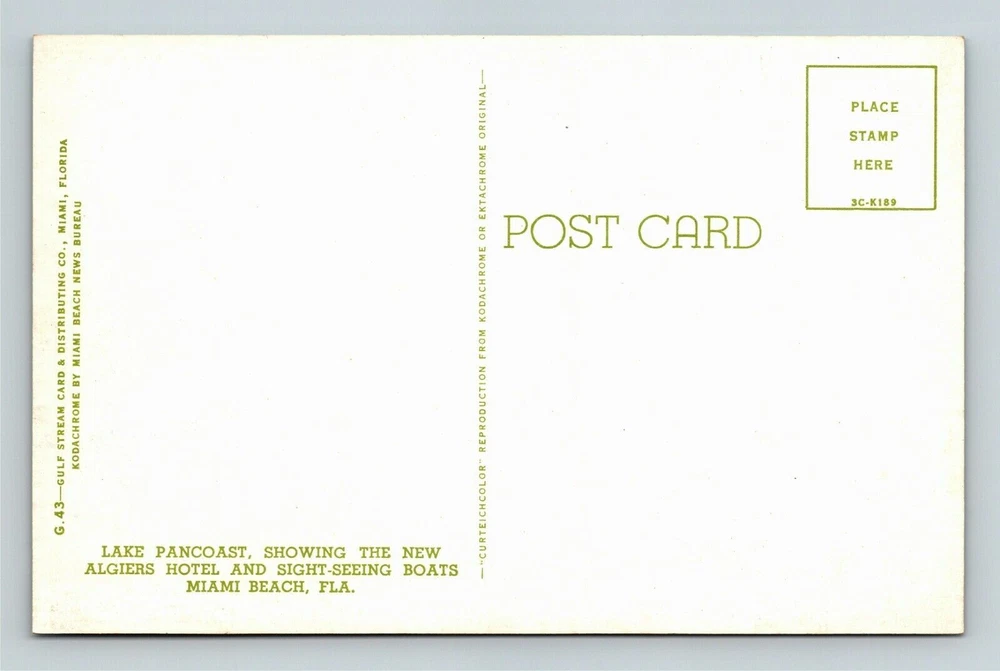 Miami Beach FL-Florida, Lake Pancoast, Algiers Hotel Vintage Souvenir Postcard