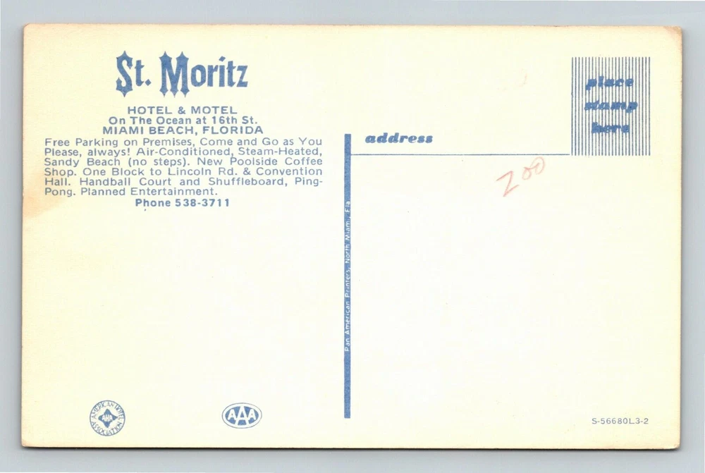 Miami Beach FL-Florida, St. Moritz Hotel & Motel Vintage Souvenir Postcard
