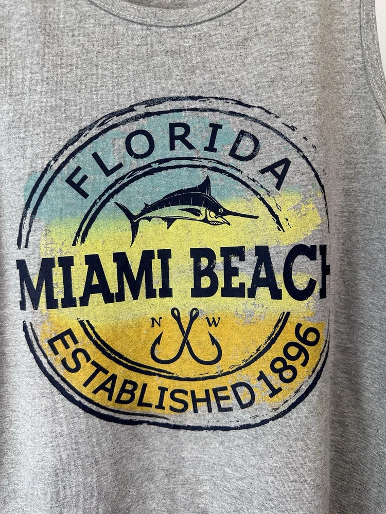 This Florida Miami Beach Cotton Tank Tee Shirt in Harriet Gray is perfect for any beach lover. The sleeveless shirt has a round neck and comes in a size M. It is machine washable and made of breathable cotton material, making it ideal for all seasons. The shirt has a vintage look, featuring the iconic 80s and 90s beach theme. It is an athletic fit and comes in a gray color. The shirt is perfect for men who are looking for a comfortable and stylish shirt to wear to the beach or for any casual occasion.