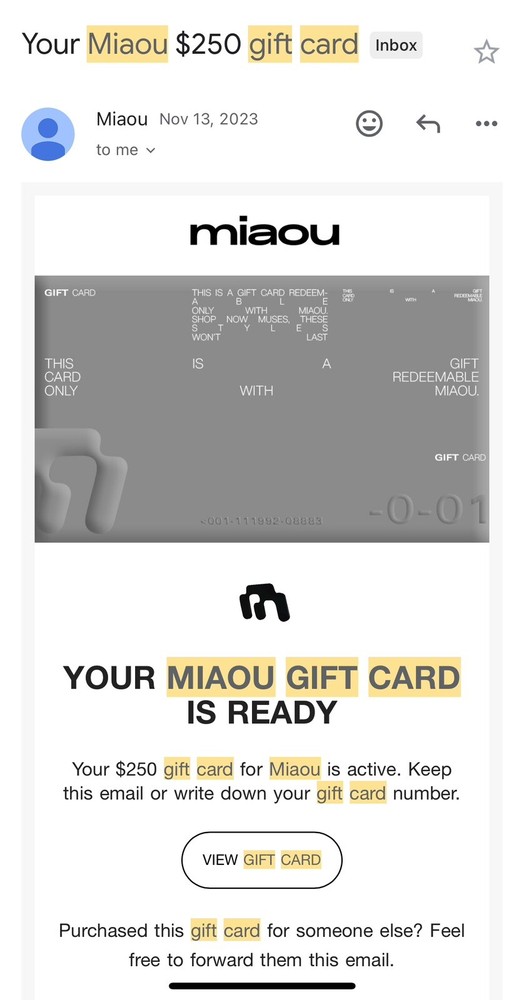 This Miaou gift card is the perfect way to show someone you care. With a value of $250, this clothing gift card can be used to purchase items from the Miaou brand. The card has no expiration month, making it a great choice for those who want to shop now or later. Whether you're looking for a gift for a loved one or simply want to treat yourself, this Miaou gift card is a great choice. It's easy to use and can be enjoyed by anyone who loves fashion. So why wait? Get your hands on this gift card today and start shopping! Useable at Miaou.com only. They have a sale going on right now, so this is a great time to get an additional $50 off your purchase if you are shopping for yourself. Or you can gift it to someone who loves the brand and save some money! 16 digit code will be sent to you immediately via eBay after purchase and I can forward the email gift card if you need to send as a gift. This code applies at checkout in the promo box and guaranteed to work.