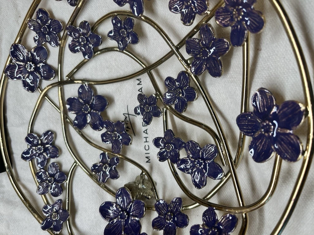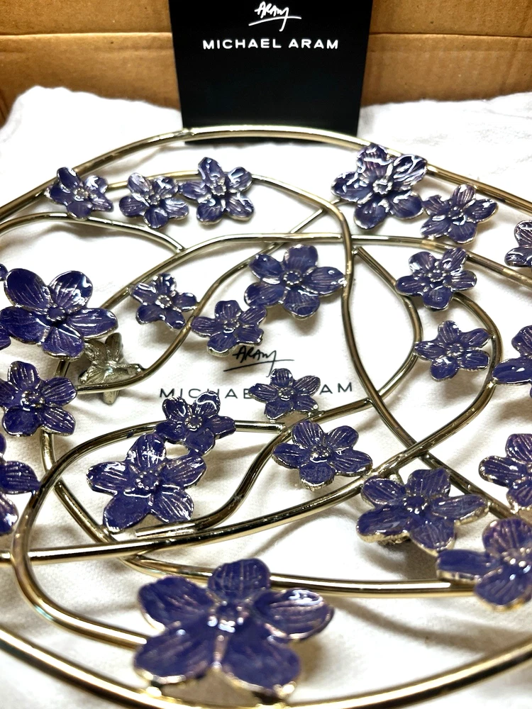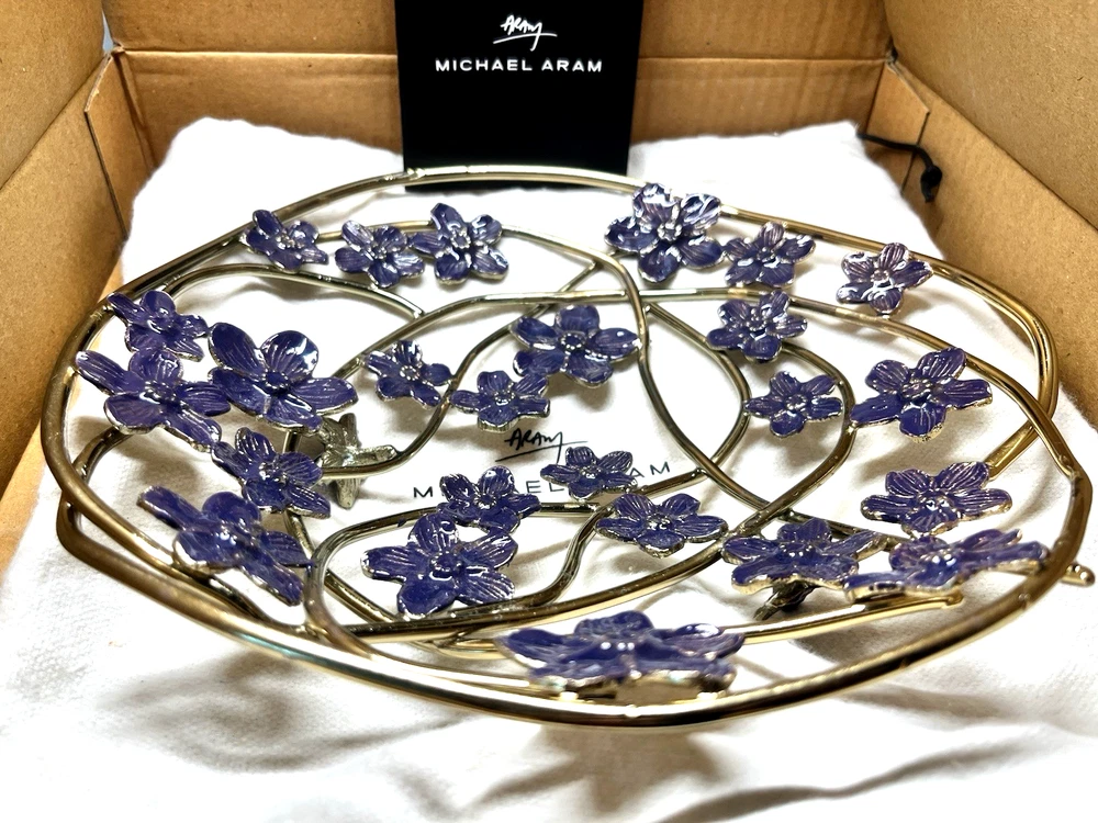 Michael Aram Forget Me Not Decorative Bowl. Elegant handcrafted piece made from natural brass with a detailed enamel finish. Beautiful floral design inspired by the Forget Me Not motif — symbolizes love, memories, and renewal. Features: Authentic Michael Aram collection Natural brass with enamel accents Approx. size: 9.5" x 9.5" x 2.5" Handcrafted artistic detailing Perfect as a centerpiece, décor accent, or gift Ships fast and securely packed. Ideal for home décor lovers and collectors.
