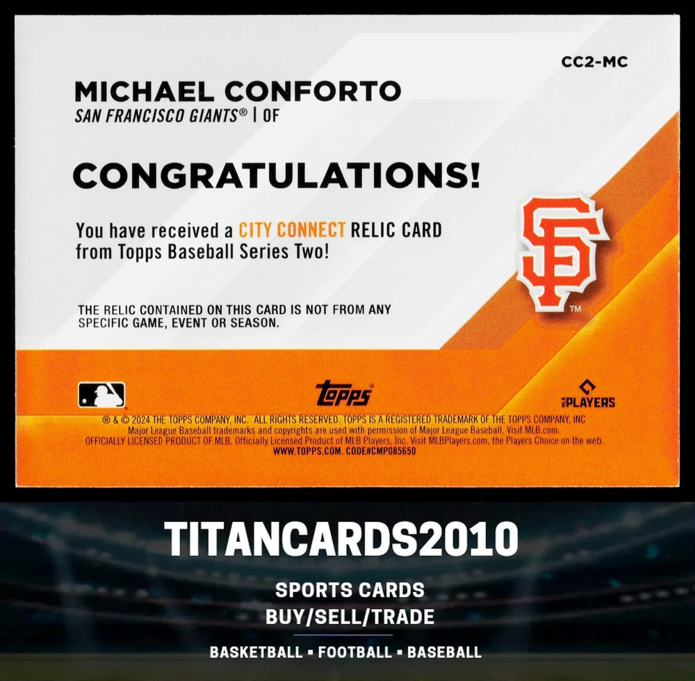 You will receive a Near Mint or Better, Michael Conforto, 2024 Topps Series Two, City Connect Relic Card, San Francisco Giants card PLEASE NOTE: SOME CARDS THAT GO THROUGH OUR SCANNER MAY APPEAR TO HAVE LINES THROUGH THEM. THEY ARE NOT ACTUAL SCRATCHES, SIMPLY FALSE IMAGE LINES. WE WILL NOT INTENTIALLY SELL, DAMAGED CARDS. NEW CARDS LISTED DAILY ORDERS SHIP NEXT DA Y (Weekends as mail service is available) VISIT OUR STORE FOR MORE DEALS! USE THE SEARCH ICON IN THE STORE TO FIND YOUR FAVORITE TEAMS & PLAYERS! Be sure to save us as sellers to be the first to be notified when new and exciting cards are posted! Please note, we are not professional graders, and the condition of the card you purchased is highly subjective. Please refer to the high quality scans of the card you are viewing, and determine the condition of the card for yourself. Feel free to reach out with questions! All cards are in EX-NM+ condition, unless stated otherwise Chrome cards from various brands might have minor light surface scratches, which is typical with these type of cards. Any major, deep scratches or major surface issues will be noted, if present. We take pride in the condition of all of our cards, including commons. Our promise to you, is that we will not sell a card we would not buy ourselves. Of course things slip by, however customer service is our #1 Priority, and we are always here for a message for ANY, and ALL issues. Thank you very much for stopping by, feel free to reach out! - Titan (Son) & Andy (Dad)