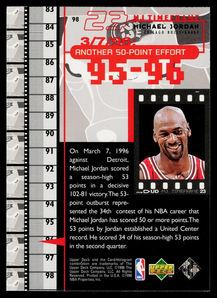 You will receive a Near Mint or Better, Michael Jordan, 1998 Upper Deck Michael Jordan Living Legend, , 98 Chicago Bulls card PLEASE NOTE: SOME CARDS THAT GO THROUGH OUR SCANNER MAY APPEAR TO HAVE LINES THROUGH THEM. THEY ARE NOT ACTUAL SCRATCHES, SIMPLY FALSE IMAGE LINES. WE WILL NOT INTENTIALLY SELL, DAMAGED CARDS. NEW CARDS LISTED DAILY ORDERS SHIP NEXT DA Y (Weekends as mail service is available) VISIT OUR STORE FOR MORE DEALS! USE THE SEARCH ICON IN THE STORE TO FIND YOUR FAVORITE TEAMS & PLAYERS! Be sure to save us as sellers to be the first to be notified when new and exciting cards are posted! Please note, we are not professional graders, and the condition of the card you purchased is highly subjective. Please refer to the high quality scans of the card you are viewing, and determine the condition of the card for yourself. Feel free to reach out with questions! All cards are in EX-NM+ condition, unless stated otherwise Chrome cards from various brands might have minor light surface scratches, which is typical with these type of cards. Any major, deep scratches or major surface issues will be noted, if present. We take pride in the condition of all of our cards, including commons. Our promise to you, is that we will not sell a card we would not buy ourselves. Of course things slip by, however customer service is our #1 Priority, and we are always here for a message for ANY, and ALL issues. Thank you very much for stopping by, feel free to reach out! - Titan (Son) & Andy (Dad)