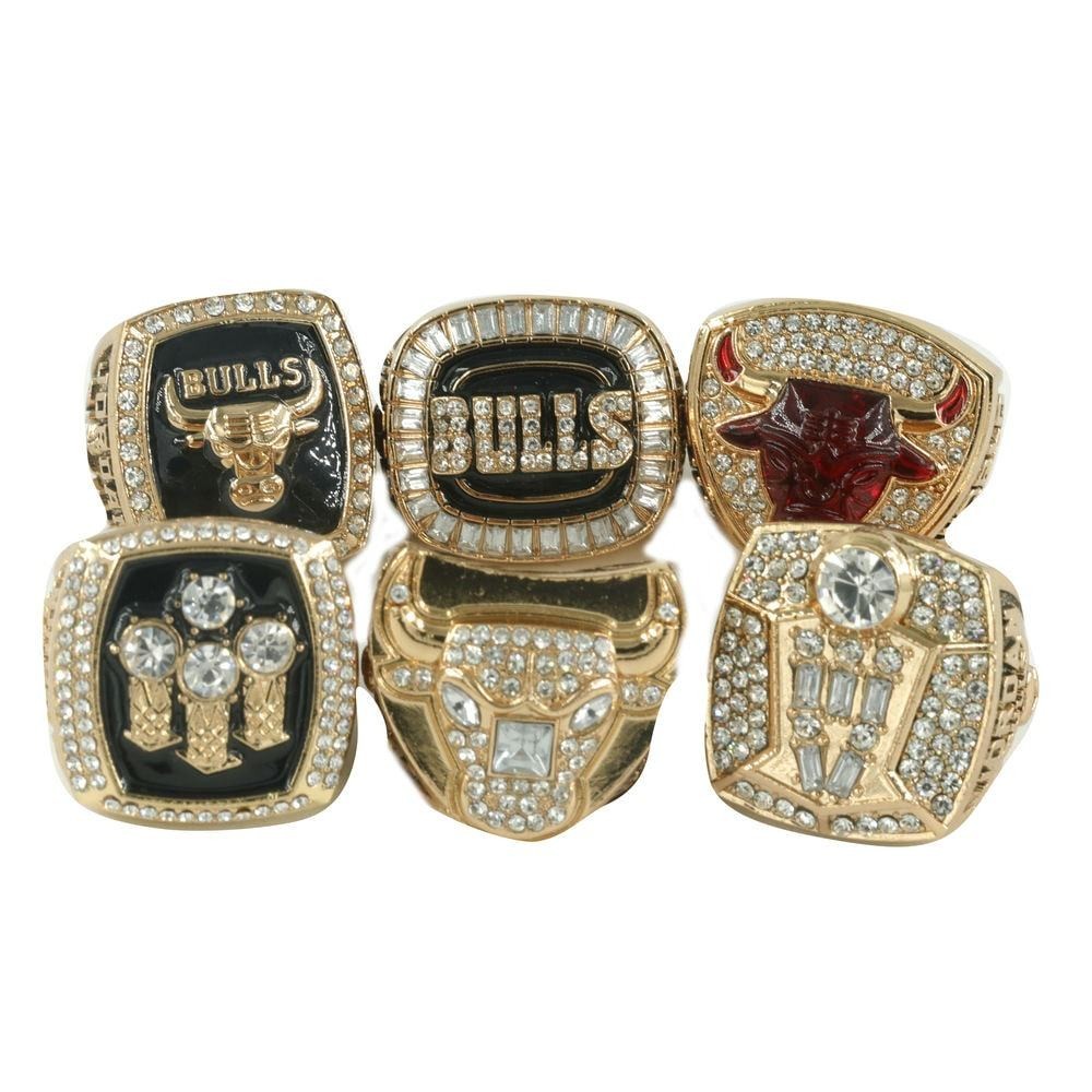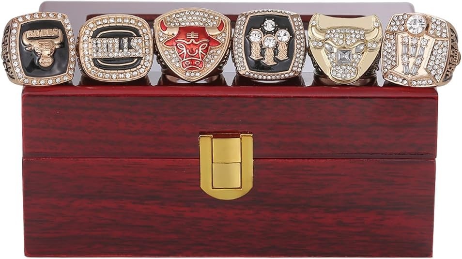 The product is a set of six championship rings won by Michael Jordan and the Chicago Bulls in the NBA Finals. Each ring is designed with a display box, making it a perfect collectible item for fans of basketball and the Bulls. The rings are 11 in size and feature multiple colors, representing the iconic team colors. This unisex adult product is a must-have for anyone looking to commemorate the legendary player and his championship achievements.