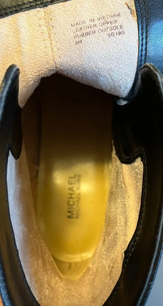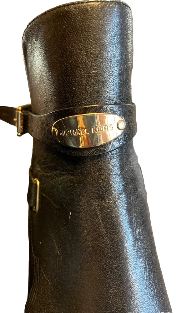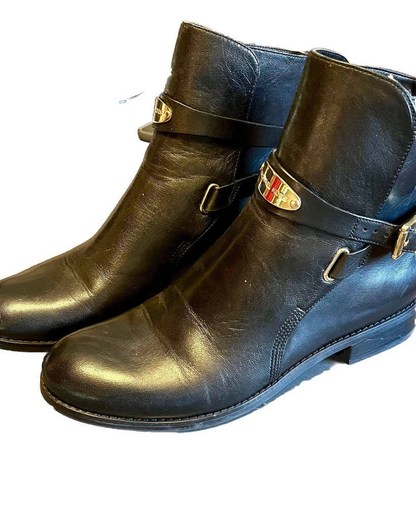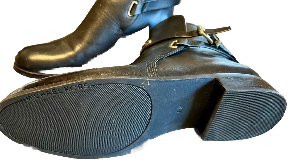 Elevate your shoe game with these stylish Michael Kors ankle boots in black leather. Featuring a closed toe, adjustable buckle strap, and a low block heel, these boots are perfect for any occasion from casual outings to formal events. The logo accents add a touch of sophistication to the overall design, while the medium ankle width and leather lining ensure comfort and durability. Ideal for winter, fall, and spring, these boots are a must-have addition to any wardrobe. Available in women's size 9 and medium shoe width, these booties are sure to become a staple in your shoe collection. Worn only once indoors - these boots are absolutely beautiful and they are very comfortable