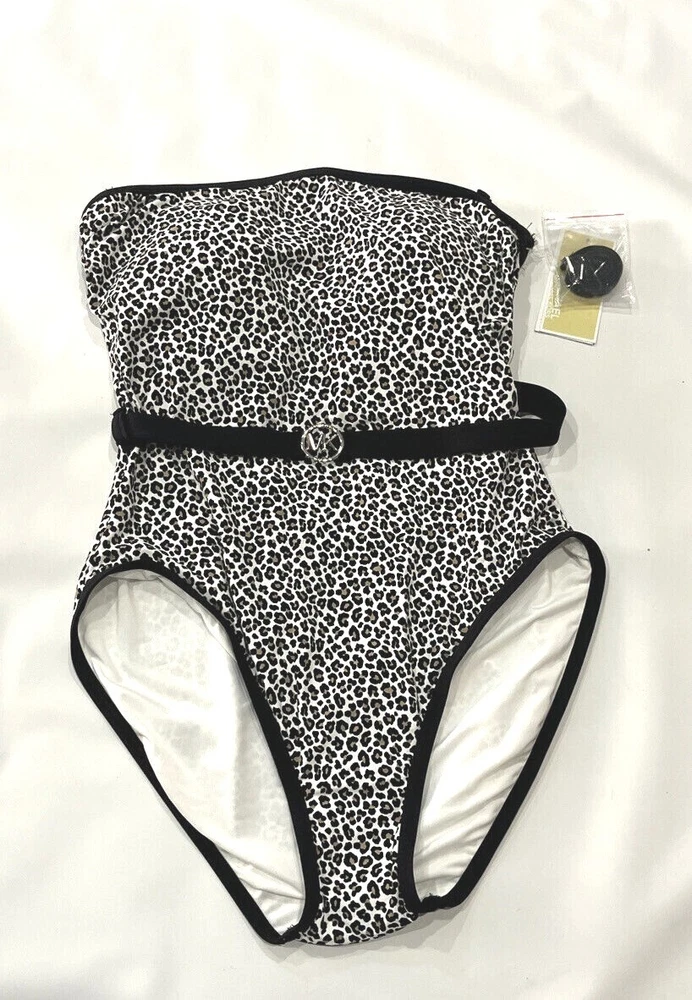 Michael Kors Logo-Belt Bandeau One-Piece Swimsuit size: 10 color: Black / Tan Bandeau neckline Removable soft cups with underwire Lined Attached belt with gold logo detail Pull-on style Optional strap Full bottom coverage Nylon/ spandex blend retail $126 K48