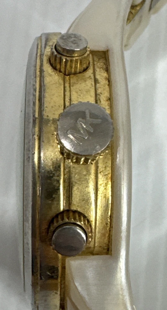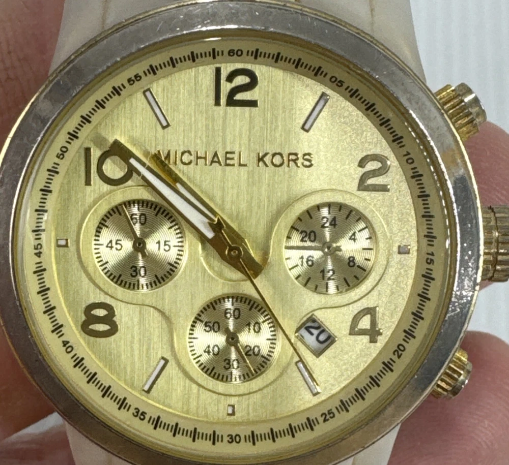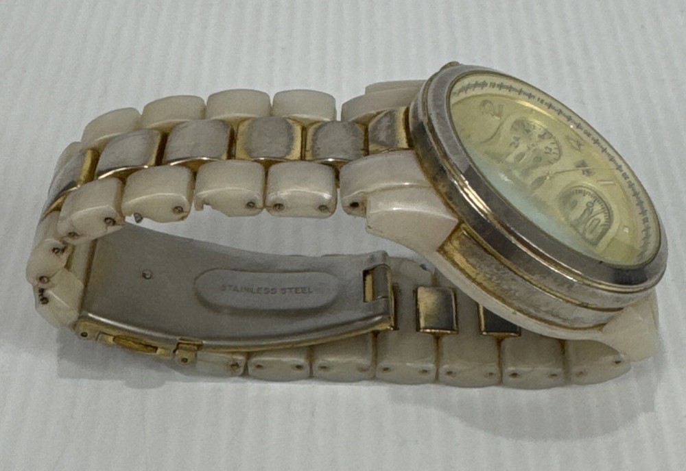 Elevate your timepiece collection with the Michael Kors MK 5139 Chromograph Ceramic Strap Gold Ladies Watch, a harmonious blend of classic style and modern craftsmanship. The watch showcases a sleek round ceramic case paired with a matching cream ceramic bracelet, exuding an air of sophistication that's both timeless and contemporary. The gold dial is accented by practical features, including a date indicator and luminous hands, ensuring both functionality and elegance. Designed for the discerning woman, this wristwatch offers a comfortable fit and a secure tri-fold clasp closure. The quartz movement ensures precise timekeeping, while the analog display provides a clear view of the time. This Michael Kors watch, crafted with attention to detail, is a perfect accessory for any occasion, seamlessly transitioning from daywear to evening attire. Watch has mark and wear & tear Selling as is Works