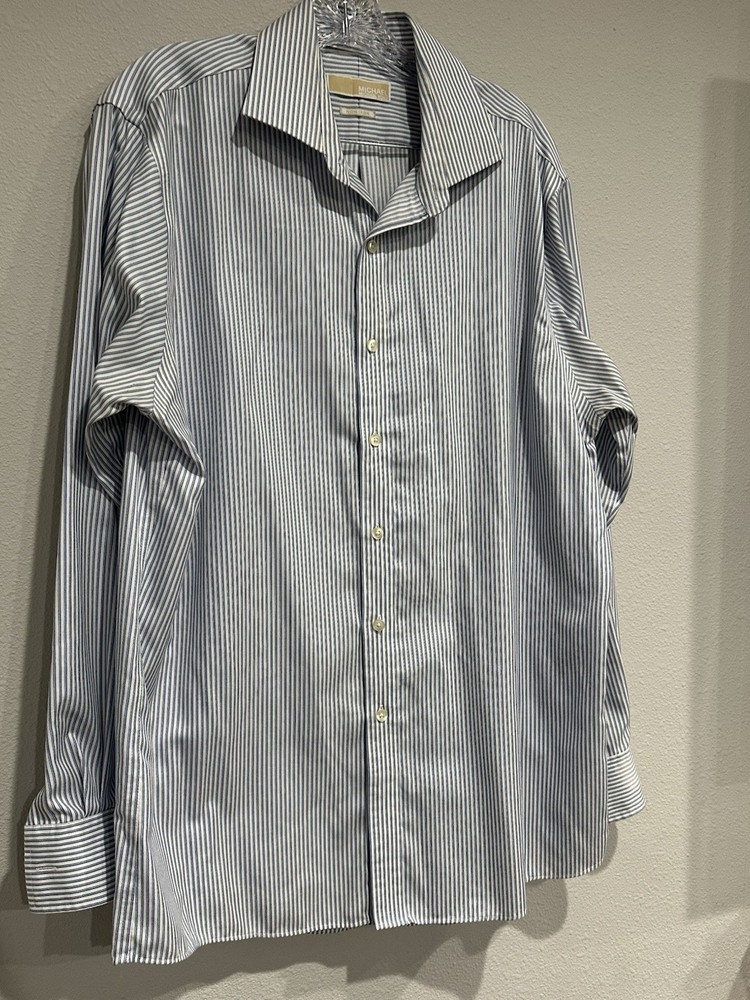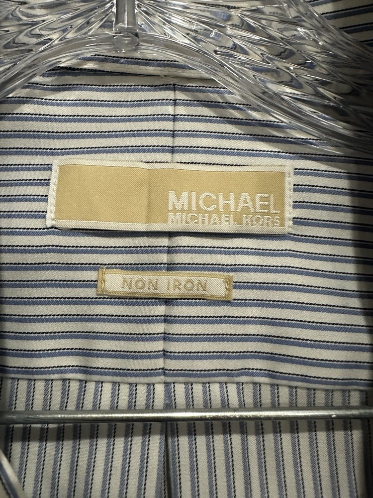 The Michael Kors Men's Button Down Dress Shirt in blue stripe is a stylish and versatile addition to any man's wardrobe. Made from cotton with a woven fabric type, this regular fit shirt features a collared neckline, button closure, and non-iron technology for easy care. With a size of 16.5 and sleeve length of 34-35, this shirt is suitable for various occasions such as parties, casual outings, formal events, and business meetings. The classic designer shirt is a timeless piece that exudes a sophisticated and colorful style for the modern man.