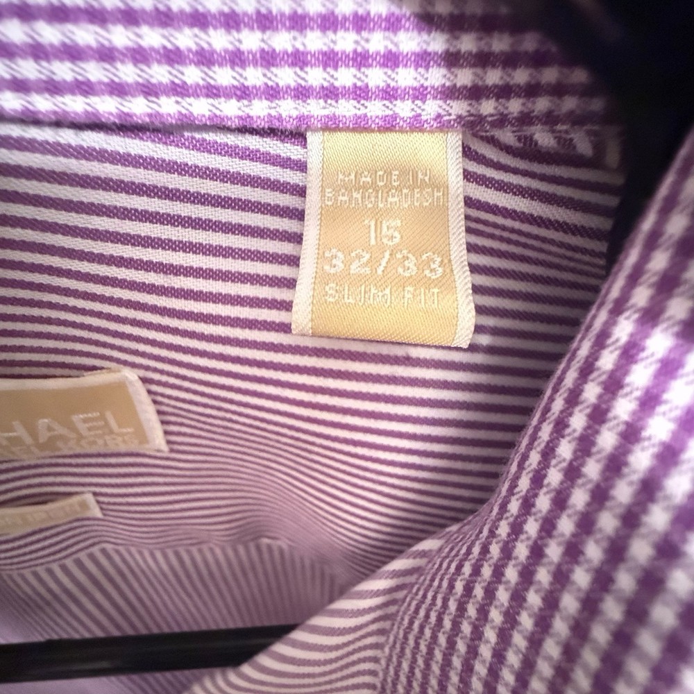Michael Kors Men’s Slim Fit Non-Iron Dress Shirt - Purple Striped - Size 15 32/33 Brand: Michael Kors Style: Slim Fit Dress Shirt Size: 15 Neck, 32/33 Sleeve Length Color: Purple & White Striped Material: 100% Cotton Fit: Slim Fit Features: • Non-Iron fabric for easy maintenance • Button-down front • Long sleeves with button cuffs • Classic pointed collar Condition: Pre-Owned, Good Condition • No visible stains, tears, or excessive wear